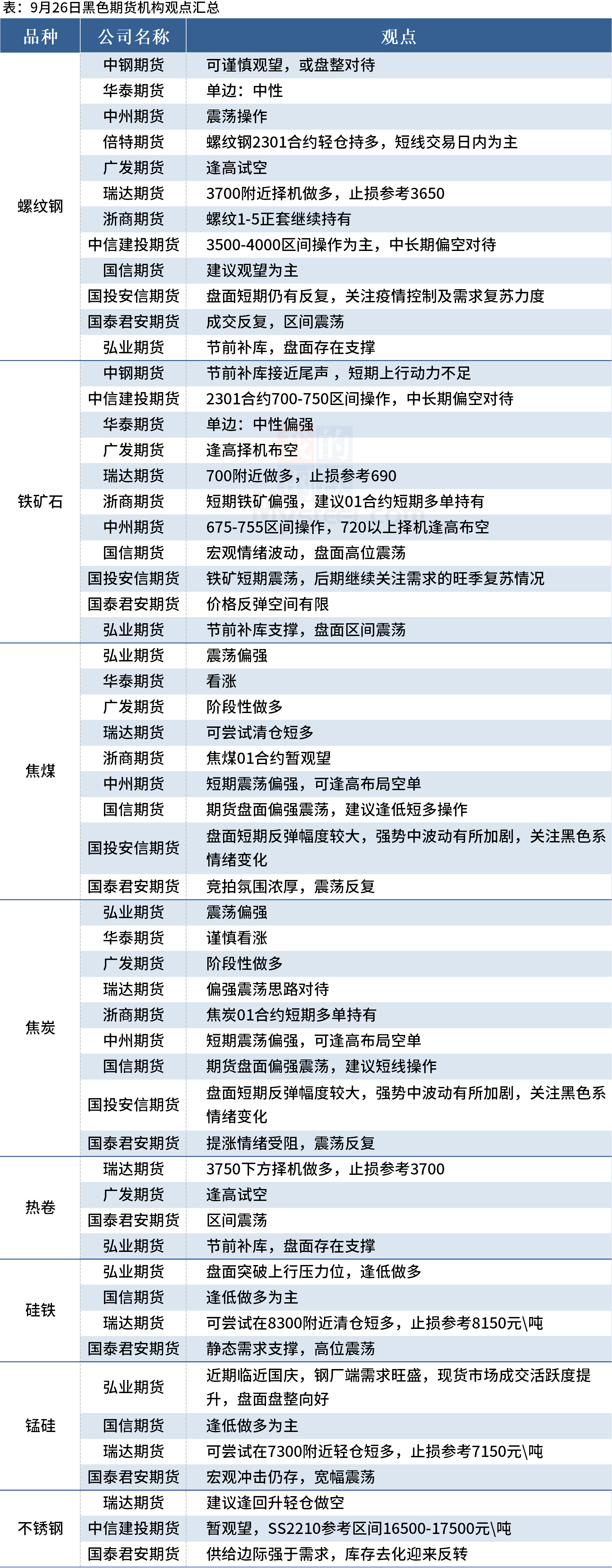 据Mysteel统计9月26日12家期货机构操作策略,其中多数机构料螺纹钢震荡运行,建议铁矿石震荡运行,焦煤、焦炭震荡偏强。具体汇总内容如下: