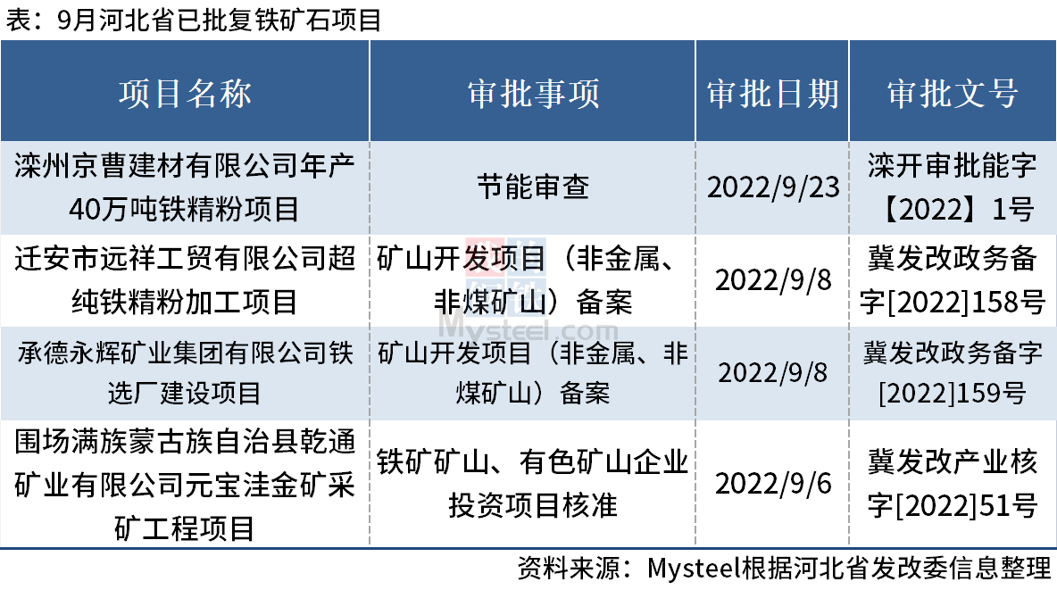Mysteel不完全统计,2022年9月河北省共批复铁矿石相关项目4个。其中,有2个矿山开发项目(非金属、非煤矿山)备案,1个节能审查和1个铁矿矿山、有色矿山企业投资项目核准。