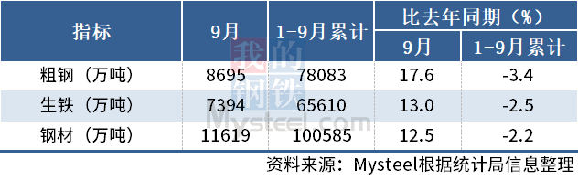 9月,中国粗钢产量8695万吨,同比增长17.6%;生铁产量7394万吨,同比增长13.0%;钢材产量11619万吨,同比增12.5%。