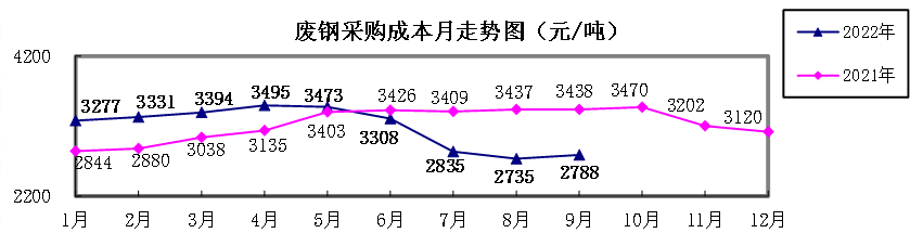 废钢9月份加权平均采购成本为2788.17元/吨,环比升高52.73元/吨,升幅为1.93%。1-9月累计平均采购成本为3226.27元/吨,同比下降8.90元/吨,降幅为0.28%。