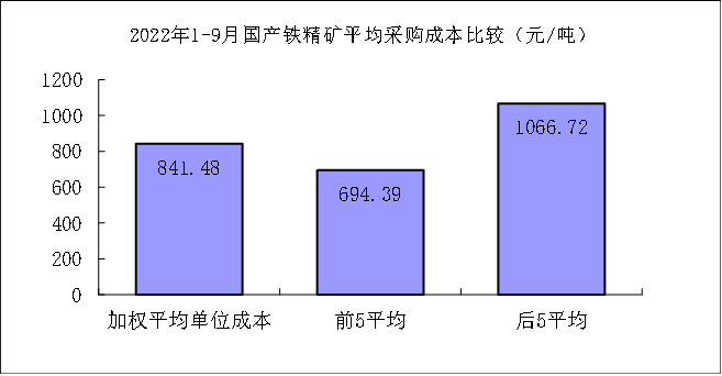 1-9月对标企业国产铁精矿折算成62%品位的平均采购成本为841.48元/吨,成本最低的前5家企业依次是九江萍钢钢铁有限公司、四川川威钢铁集团公司、四川德胜集团钒钛有限公司、陕西略阳钢铁有限公司、昆明钢铁股份有限公司,这5家企业的加权平均采购成本为694.39元/吨,比对标企业平均采购成本低147.09元/吨,低于平均采购成本17.48%;而采购成本最高的5家企业的加权平均采购成本为1066.72元/吨,比对标企业平均采购成本高225.24元/吨,高于平均采购成本26.77%。