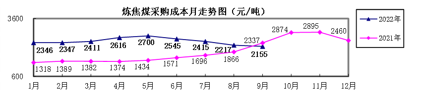 对标企业炼焦煤9月份加权平均折算成干基的采购成本为2154.82元/吨,环比下降62.41元/吨,降幅为2.81%。1-9月累计平均折算成干基的采购成本为2414.10元/吨,同比升高816.22元/吨,升幅为51.08%。