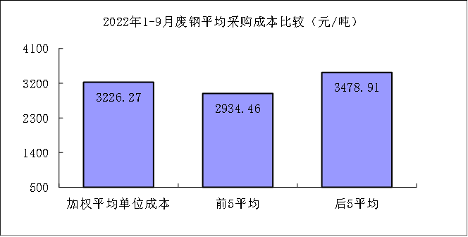 1-9月对标企业废钢平均采购成本最低的前5家企业的加权平均采购成本为2934.46元/吨,比对标企业平均采购成本低291.81元/吨,低于平均采购成本9.04%;而采购成本最高的5家企业加权平均采购成本为3478.91元/吨,比对标企业平均采购成本高252.64元/吨,高于平均采购成本7.83%。