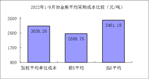 1-9月对标企业冶金焦平均采购成本最低的前5家企业的加权平均采购成本为2568.75元/吨,比对标企业平均采购成本低469.51元/吨,低于平均采购成本15.45%;而采购成本最高的5家企业的加权平均采购成本为3401.19元/吨,比对标企业平均采购成本高362.93元/吨,高于平均采购成本11.95%。