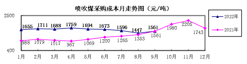 喷吹煤9月份加权平均折算成干基的采购成本为1560.83元/吨,环比升高113.84元/吨,升幅为7.87%。1-9月累计平均折算成干基的采购成本为1628.11元/吨,同比升高467.31元/吨,升幅为40.26%。