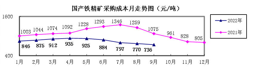 2022年9月,铁矿石、焦煤和焦炭等采购成本继续下降,但喷吹煤动力煤生铁废钢成本有所回升。