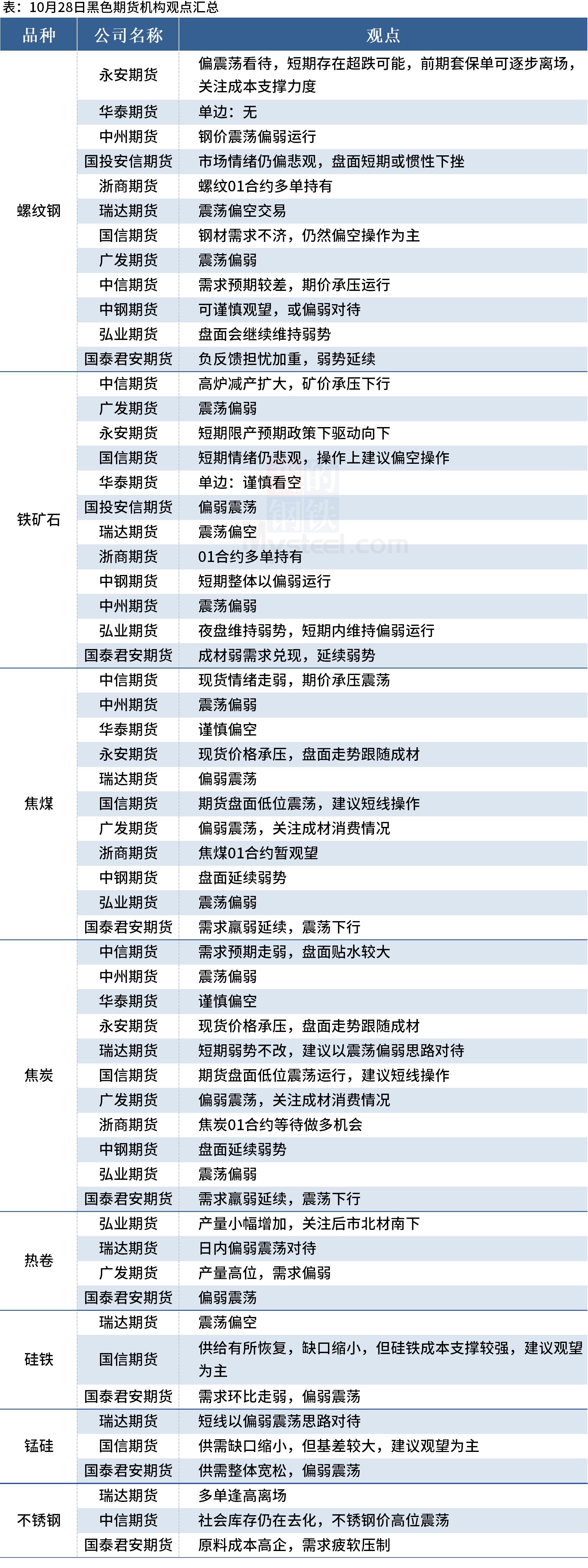 Mysteel统计10月28日12家期货机构操作策略,其中多数机构料螺纹钢震荡偏弱,料铁矿石震荡偏弱,焦煤、焦炭震荡偏弱。具体汇总内容如下: