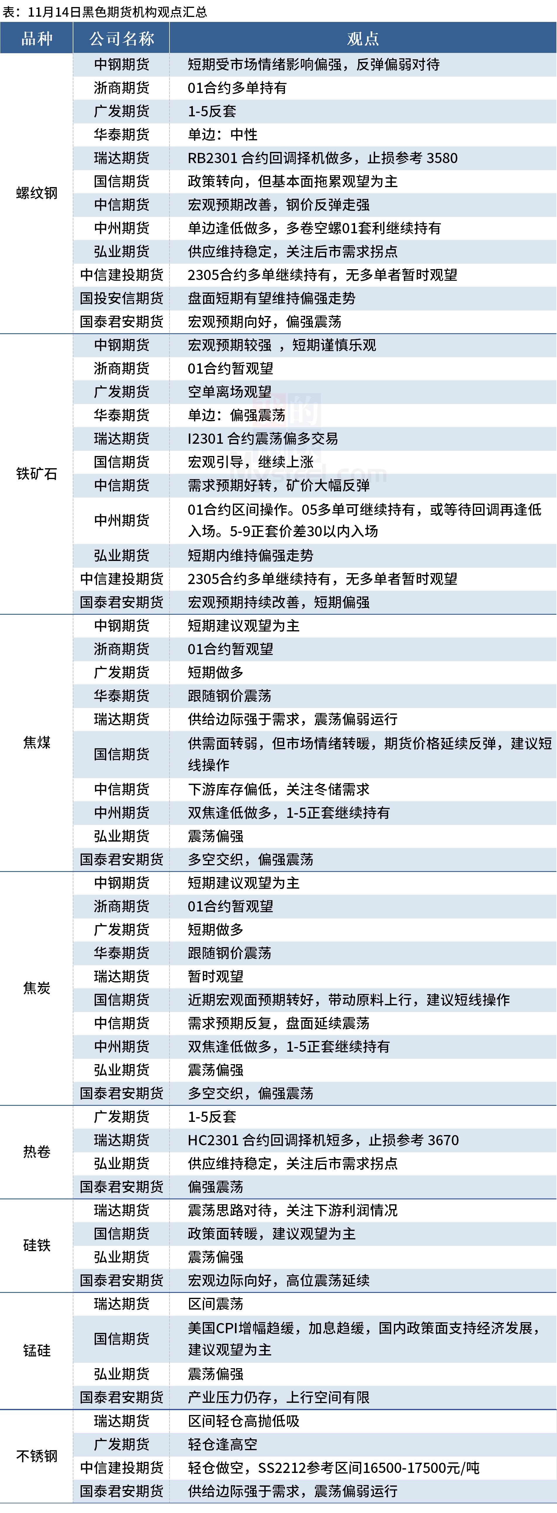 Mysteel统计11月14日12家期货机构操作策略,其中多数机构建议螺纹钢震荡偏强,建议铁矿石震荡偏强,焦煤、焦炭震荡运行。具体汇总内容如下: