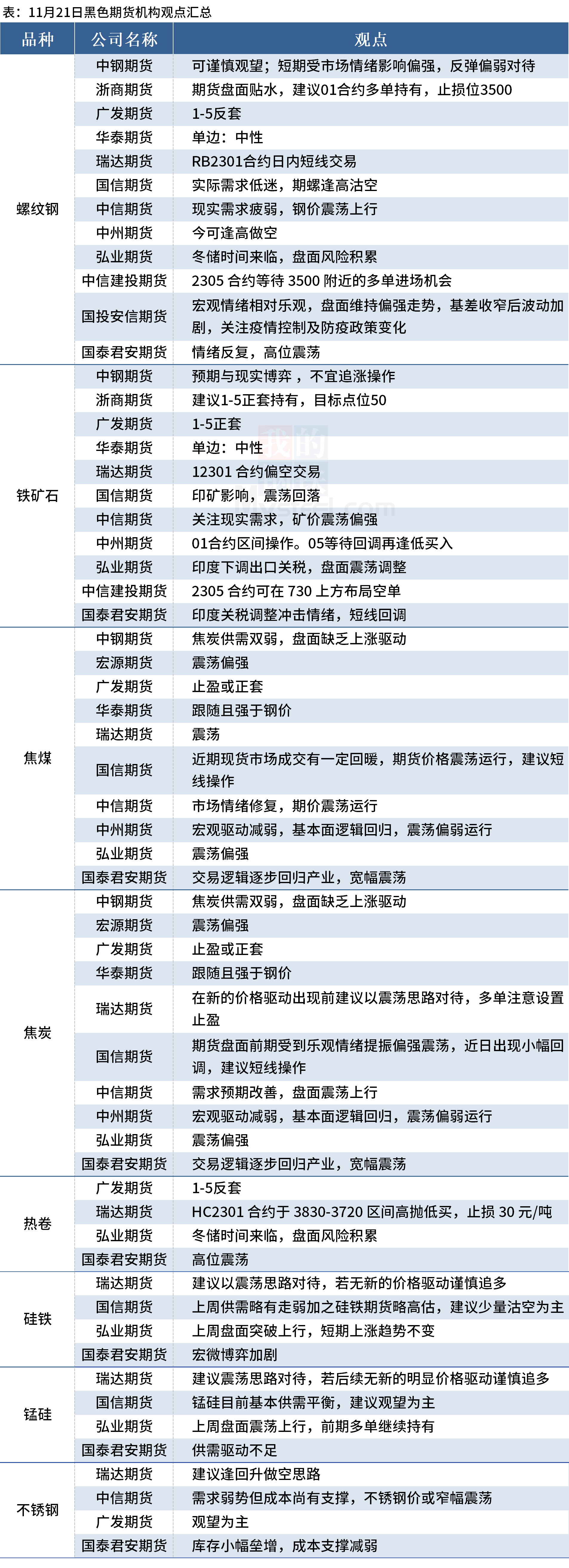 据Mysteel统计11月21日12家期货机构操作策略,其中多数机构建议螺纹钢震荡运行,建议铁矿石震荡运行,焦煤、焦炭震荡运行。具体汇总内容如下: