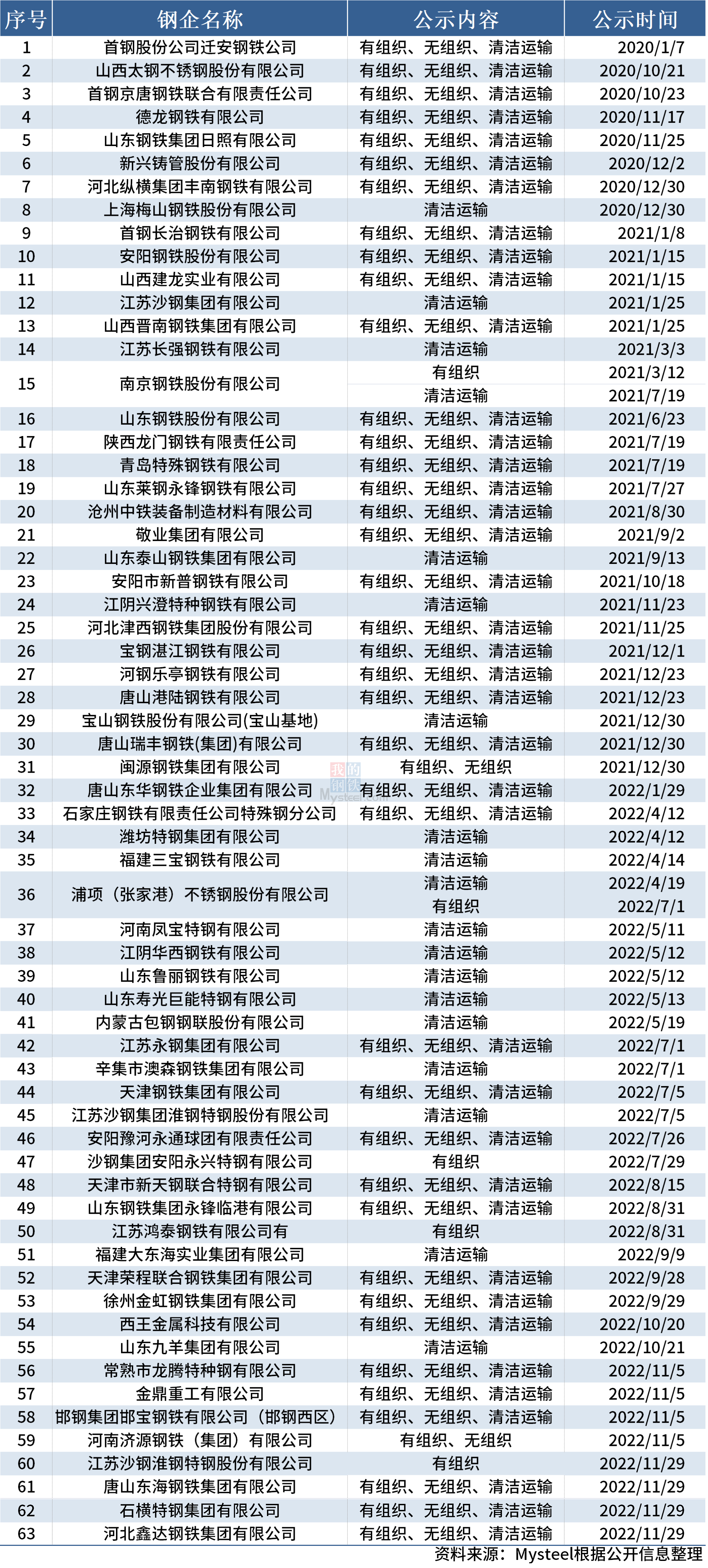 自2020年8月起,中国钢铁工业协会开展了钢铁企业超低排放改造和评估监测进展情况公示工作。截至2022年11月29日,已有63家钢铁企业在钢协网站进行公示。11月以来新增8家企业,常熟市龙腾特种钢、金鼎重工、邯钢集团邯宝钢铁、河南济源钢铁、江苏沙钢淮钢特钢、唐山东海钢铁、石横特钢集团和河北鑫达钢铁集团。