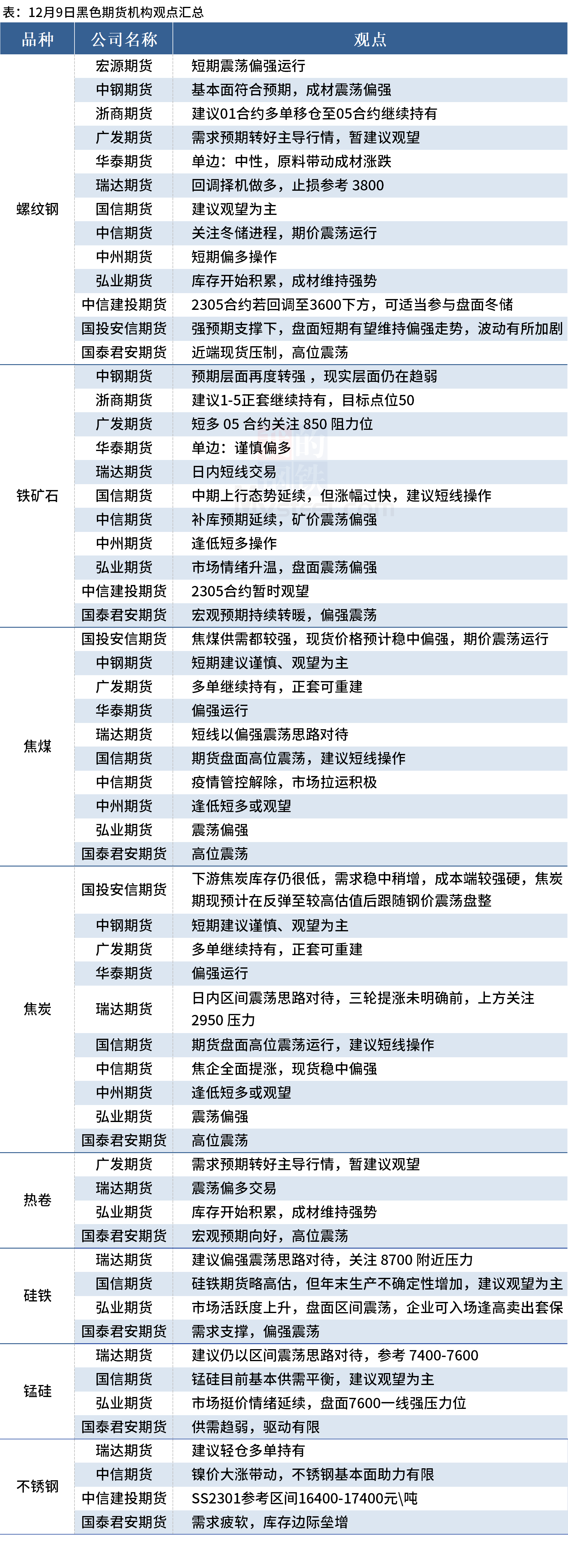 据Mysteel统计12月9日13家期货机构操作策略,其中多数机构建议螺纹钢震荡运行,建议铁矿石震荡偏强,焦煤、焦炭震荡运行。具体汇总内容如下: