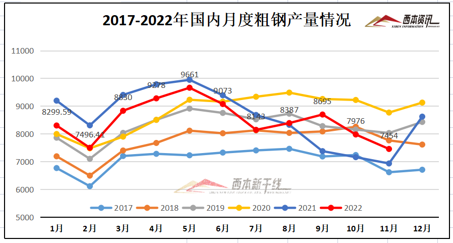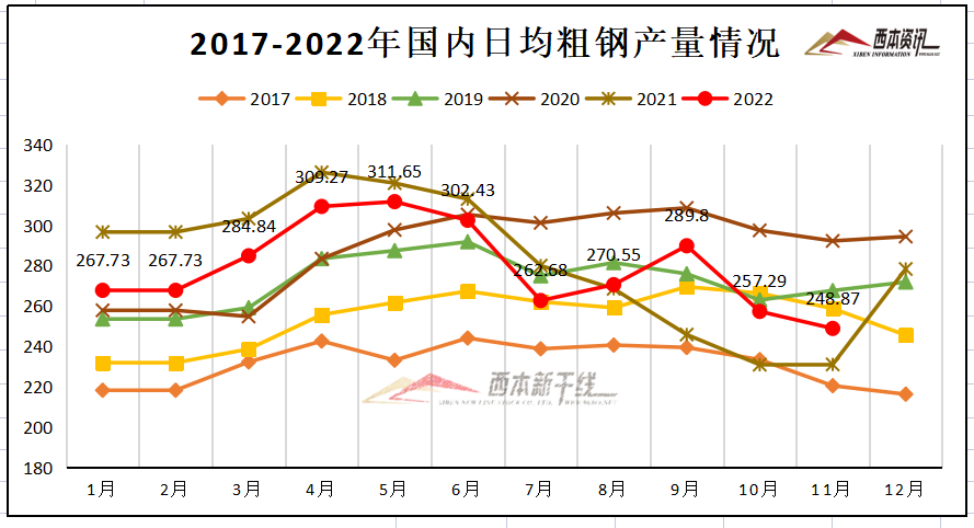 国家统计局数据显示:2022年11月,中国粗钢日均产量248.47万吨,环比下降3.4%;生铁日均产量226.63万吨,环比下降0.8%;钢材日均产量363.97万吨,环比下降1.8%。