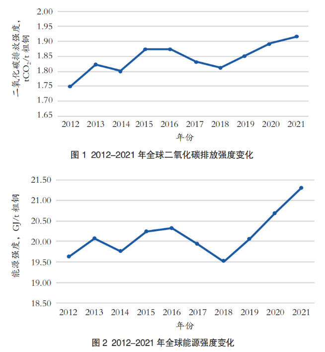 2012-2021年全球二氧化碳排放强度和能源强度的变化见图1和图2。由图可知,在2017和2018年这两个可持续指标连续两年下降后,从2019年开始持续上升,2021年的两个指标均创历史新高,因此,全球钢铁行业仍面临遏制二氧化碳排放的挑战。