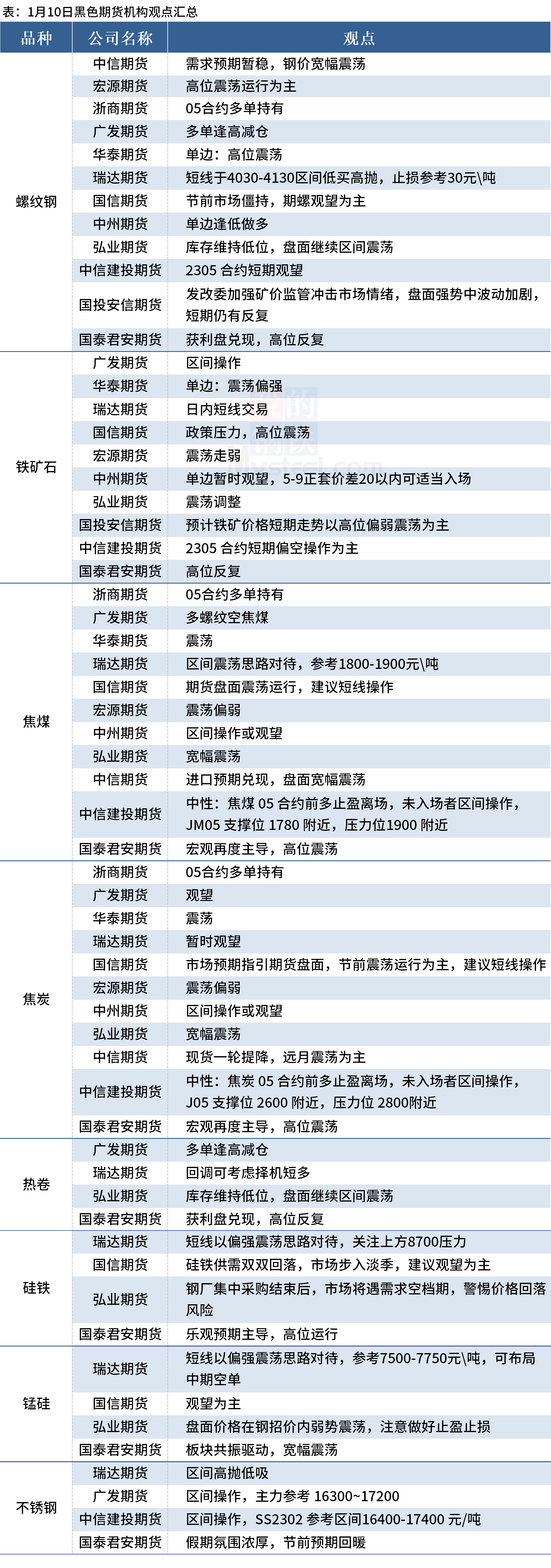 据Mysteel统计1月10日12家期货机构操作策略,其中多数机构建议螺纹钢震荡运行,建议铁矿石震荡运行,焦煤、焦炭震荡偏弱。具体汇总内容如下: