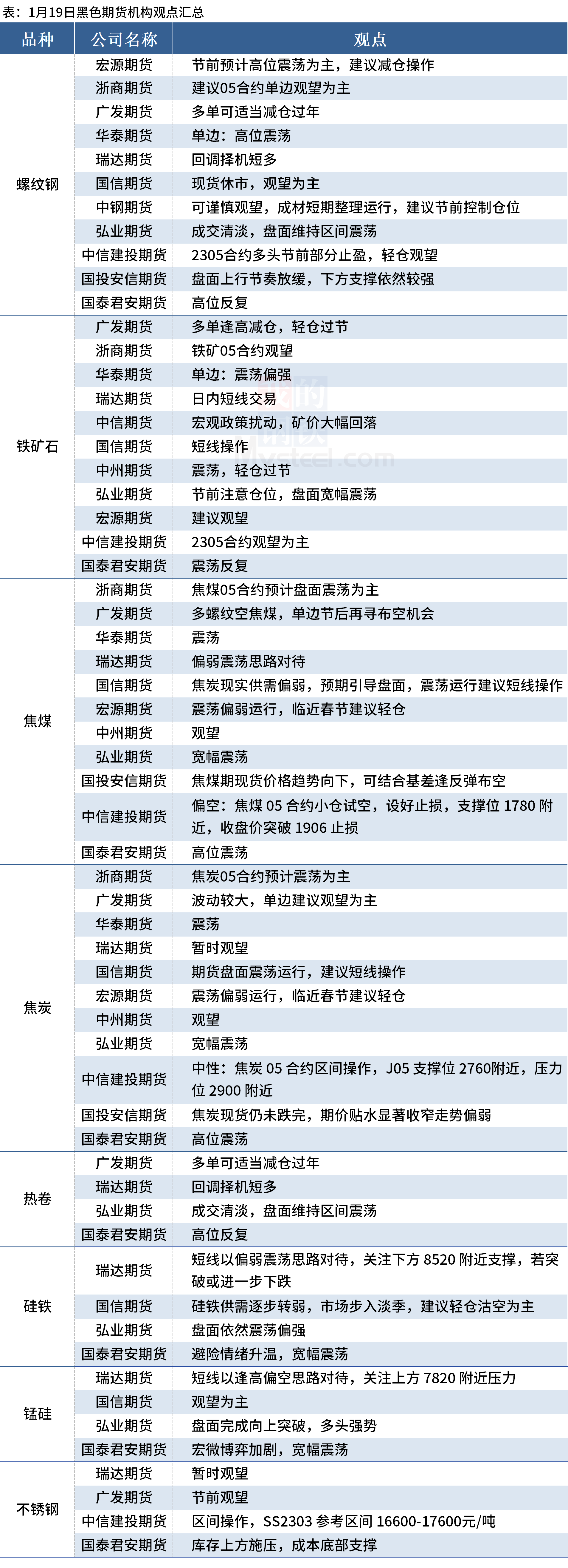 Mysteel统计1月19日12家期货机构操作策略,其中多数机构建议螺纹钢震荡运行,建议铁矿石震荡运行,焦煤、焦炭震荡偏弱。具体汇总内容如下: