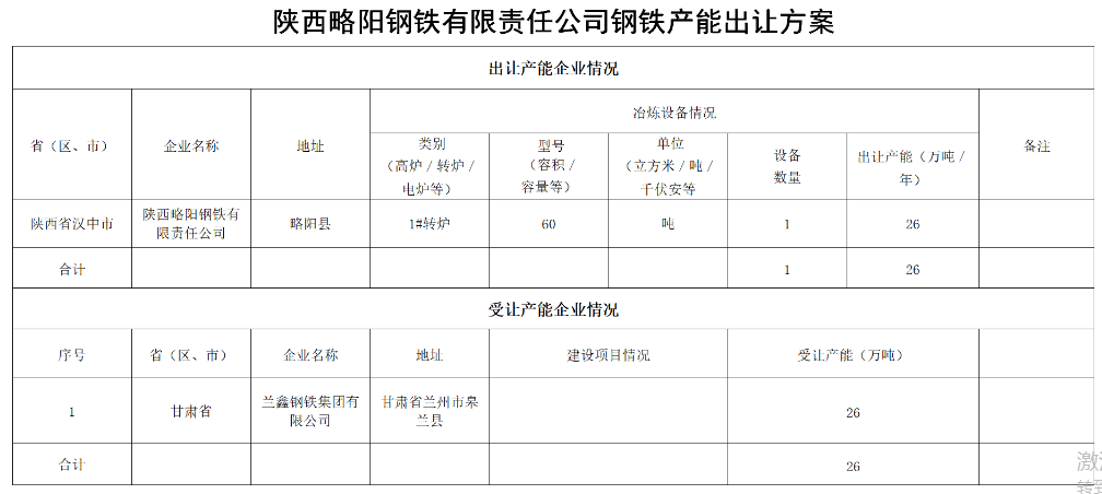 陕西略阳钢铁产能置换方案和产能出让方案公示