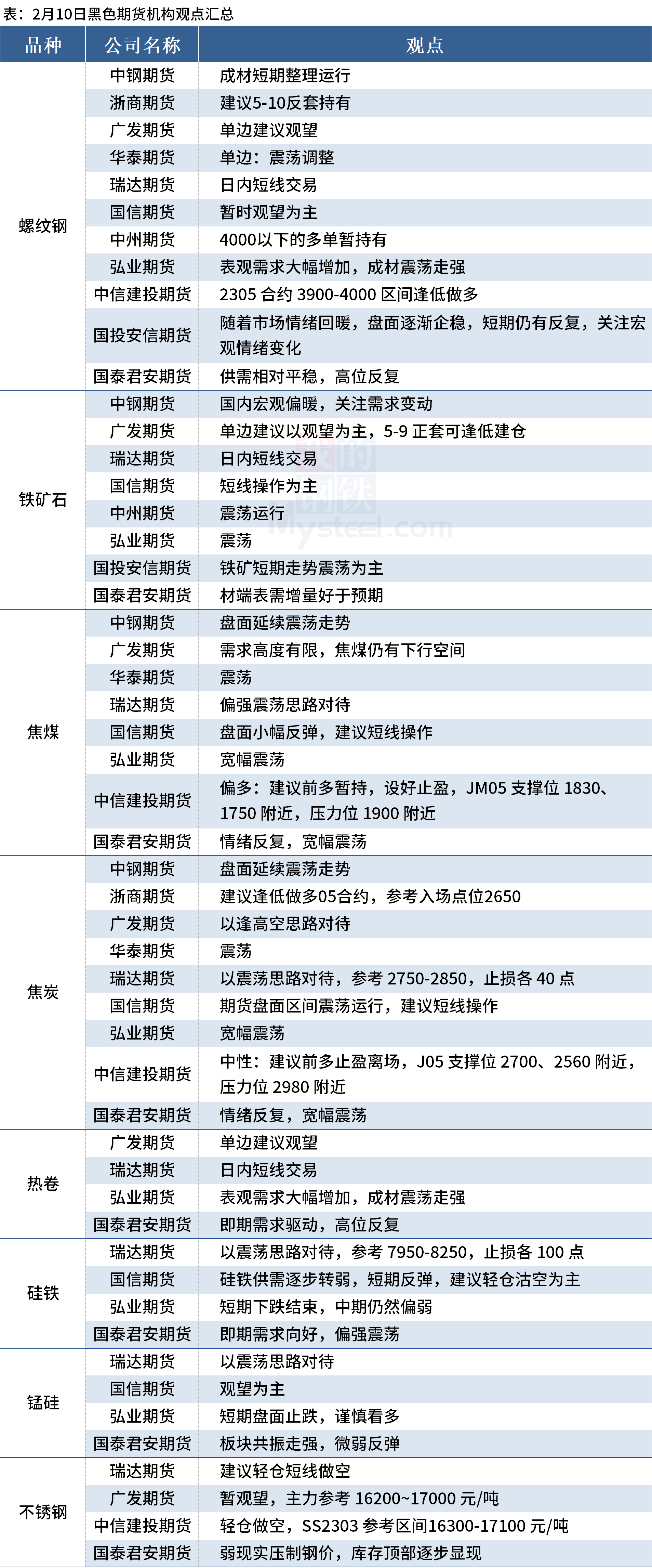 Mysteel统计2月10日11家期货机构操作策略,其中多数机构建议螺纹钢震荡运行,建议铁矿石震荡运行,焦煤、焦炭震荡运行。具体汇总内容如下: