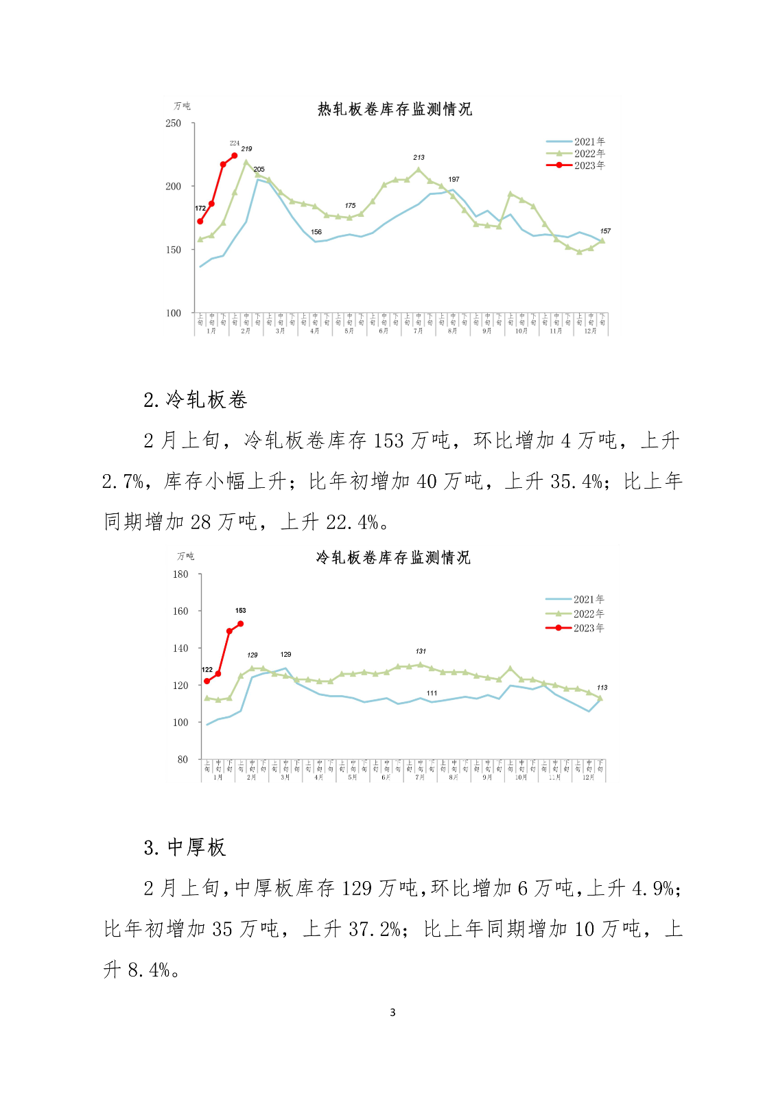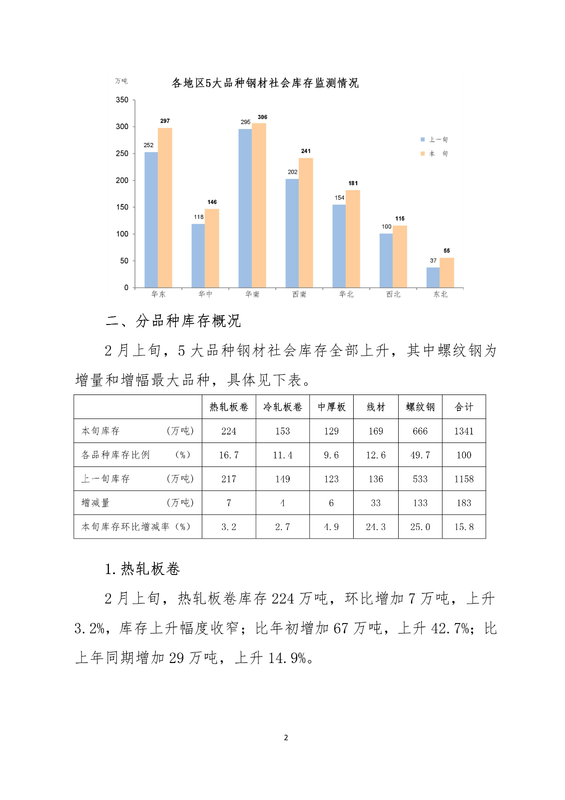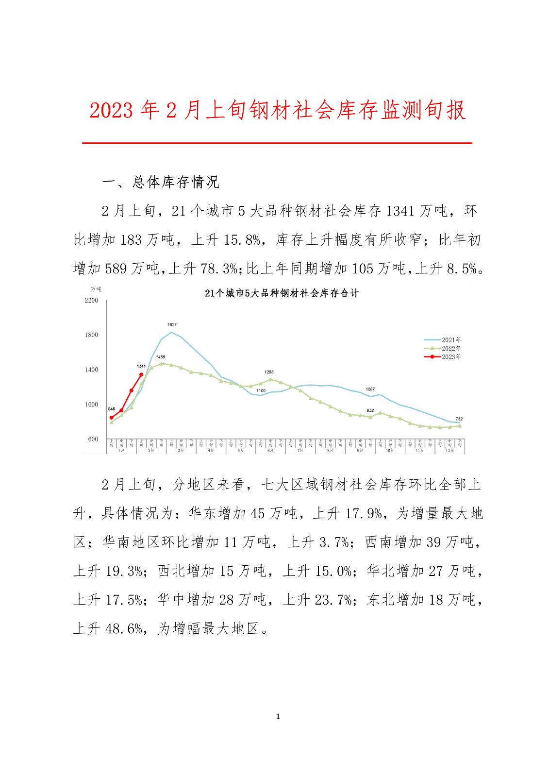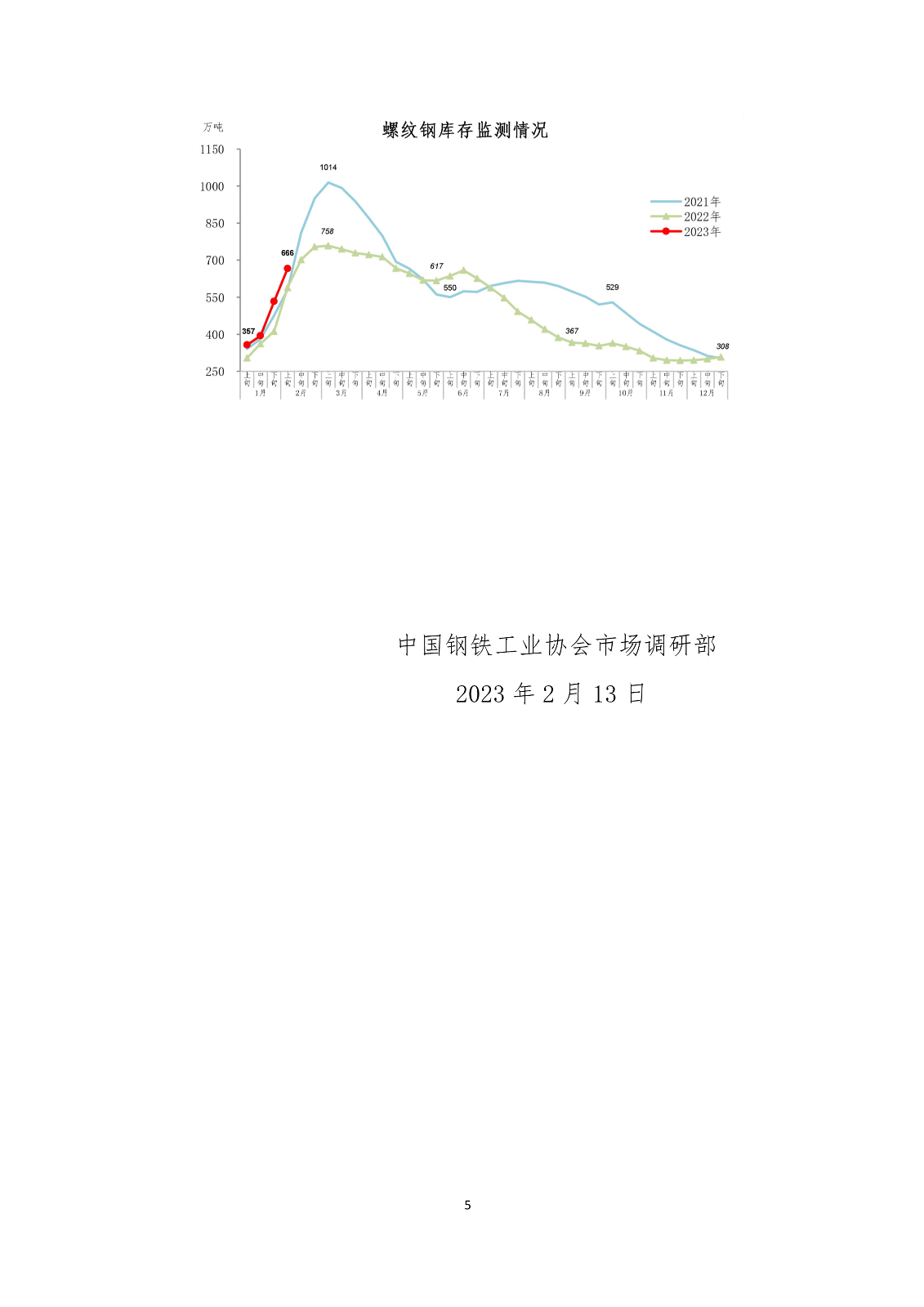 2月上旬,21个城市5大品种钢材社会库存1341万吨,环比增加183万吨,上升15.8%,库存上升幅度有所收窄;比年初增加589万吨,上升78.3%;比上年同期增加105万吨,上升8.5%。其中,螺纹钢库存666万吨,环比增加133万吨,上升25.0%,库存继续快速上升;比年初增加358万吨,上升116.2%;比上年同期增加77万吨,上升13.1%。