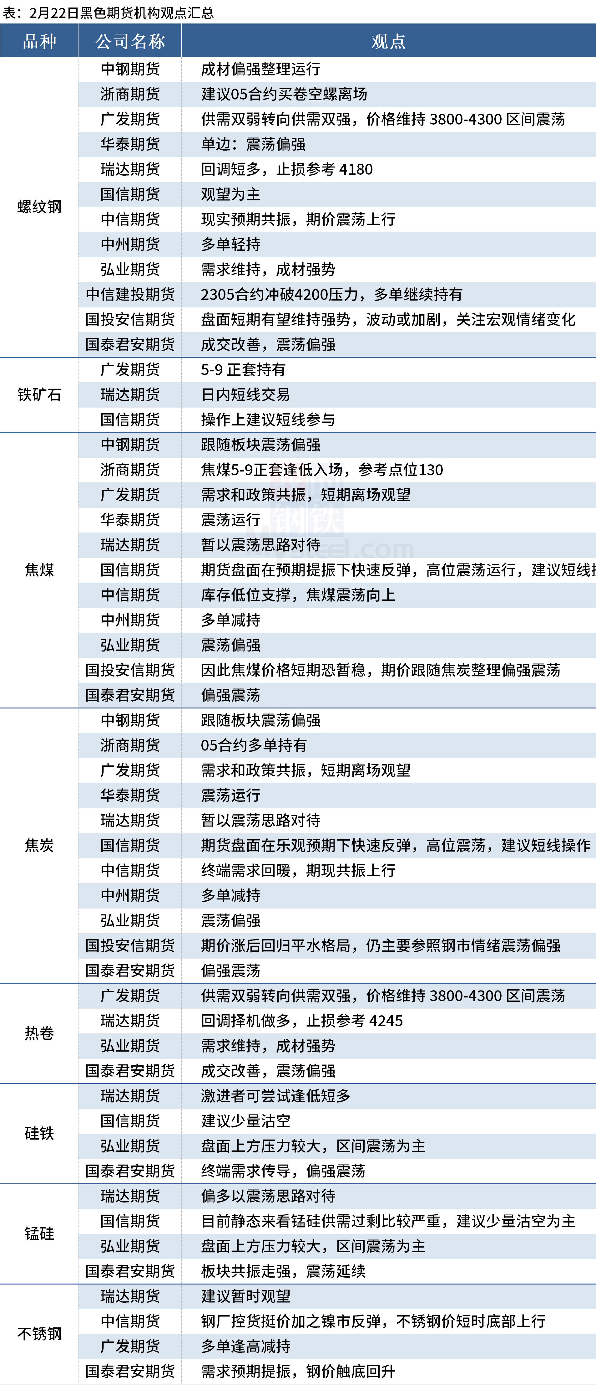 据Mysteel统计2月22日12家期货机构操作策略,其中多数机构建议螺纹钢震荡运行,建议铁矿石震荡运行,焦煤、焦炭震荡运行。具体汇总内容如下: