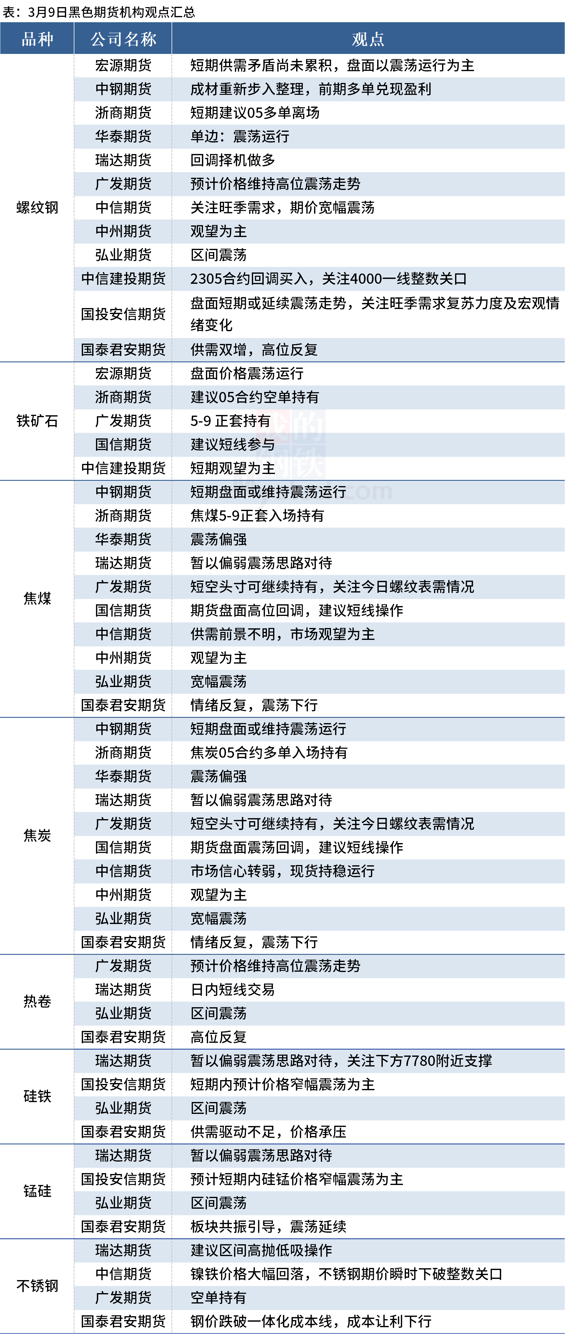 据Mysteel统计3月9日12家期货机构操作策略,其中多数机构建议螺纹钢震荡运行,建议铁矿石震荡运行,焦煤、焦炭震荡运行。具体汇总内容如下: