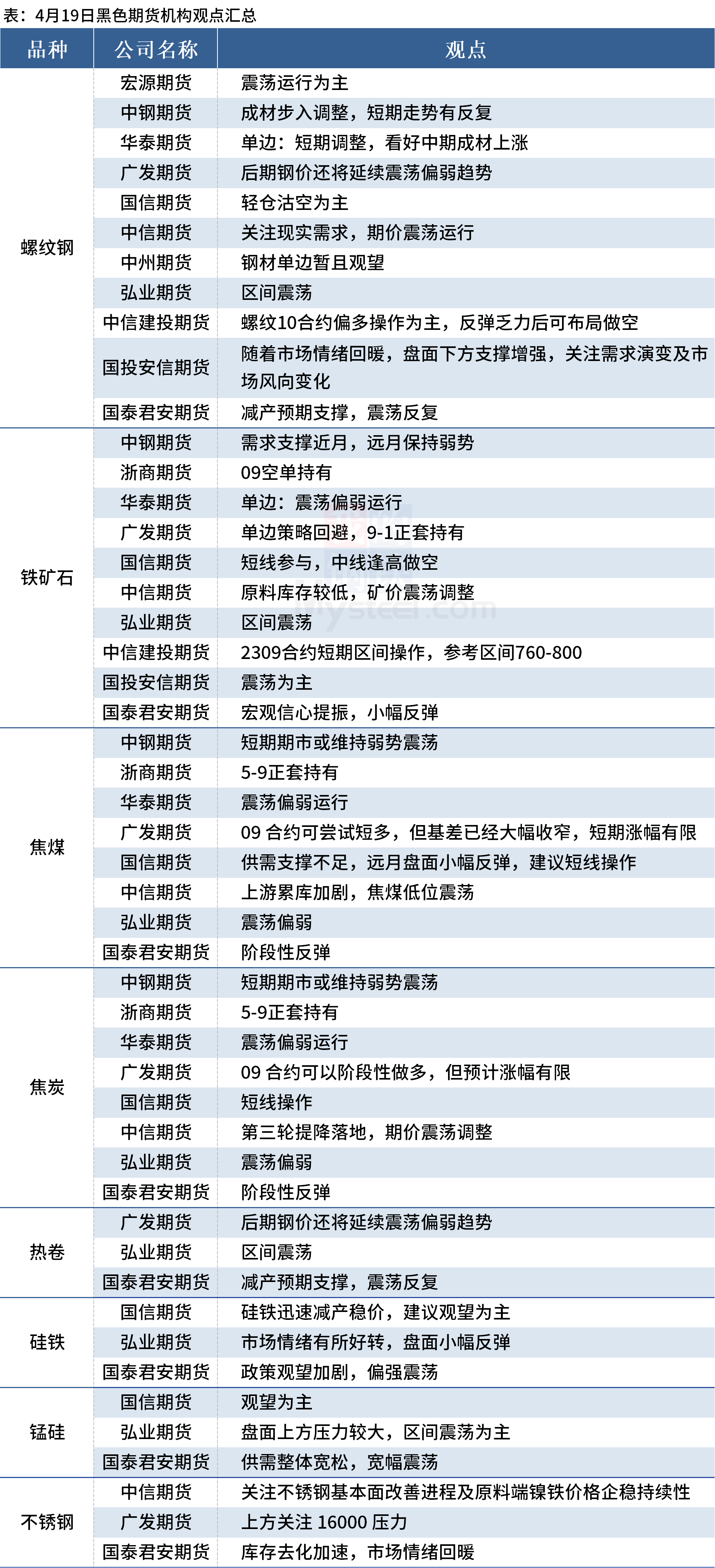 据Mysteel统计4月19日11家期货机构操作策略,其中多数机构建议螺纹钢震荡运行,建议铁矿石震荡运行,焦煤、焦炭震荡偏弱。具体汇总内容如下: