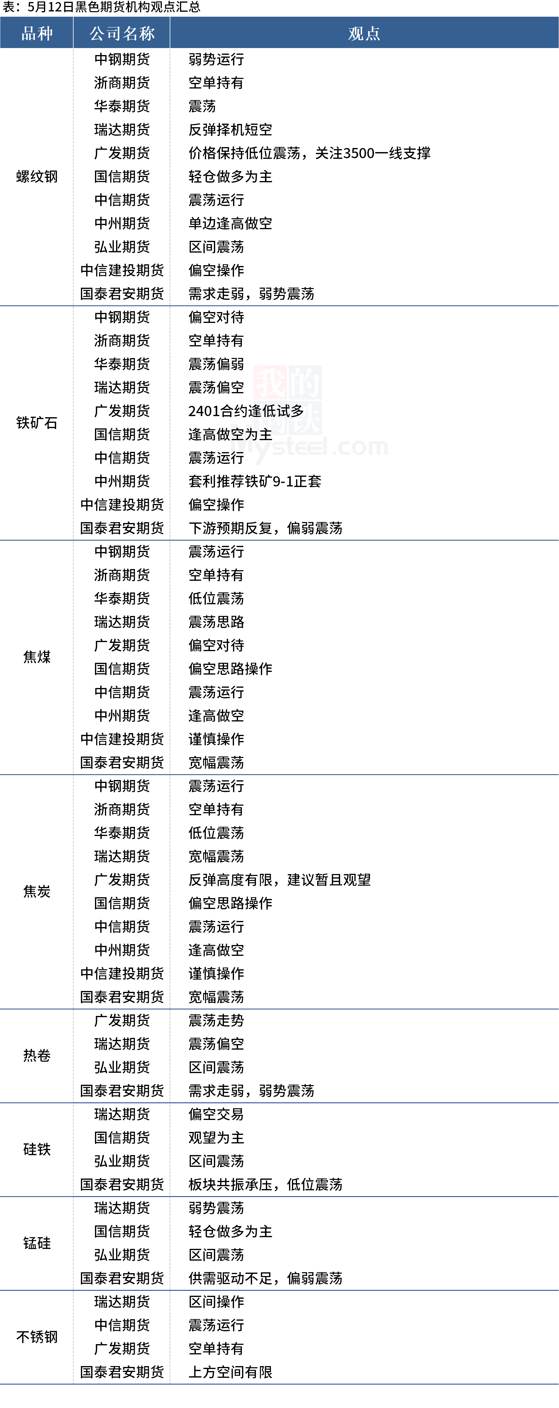 Mysteel统计5月12日11家期货机构操作策略,其中多数机构料螺纹钢震荡偏弱运行,铁矿石弱势震荡,焦煤、焦炭偏空震荡。具体汇总内容如下: