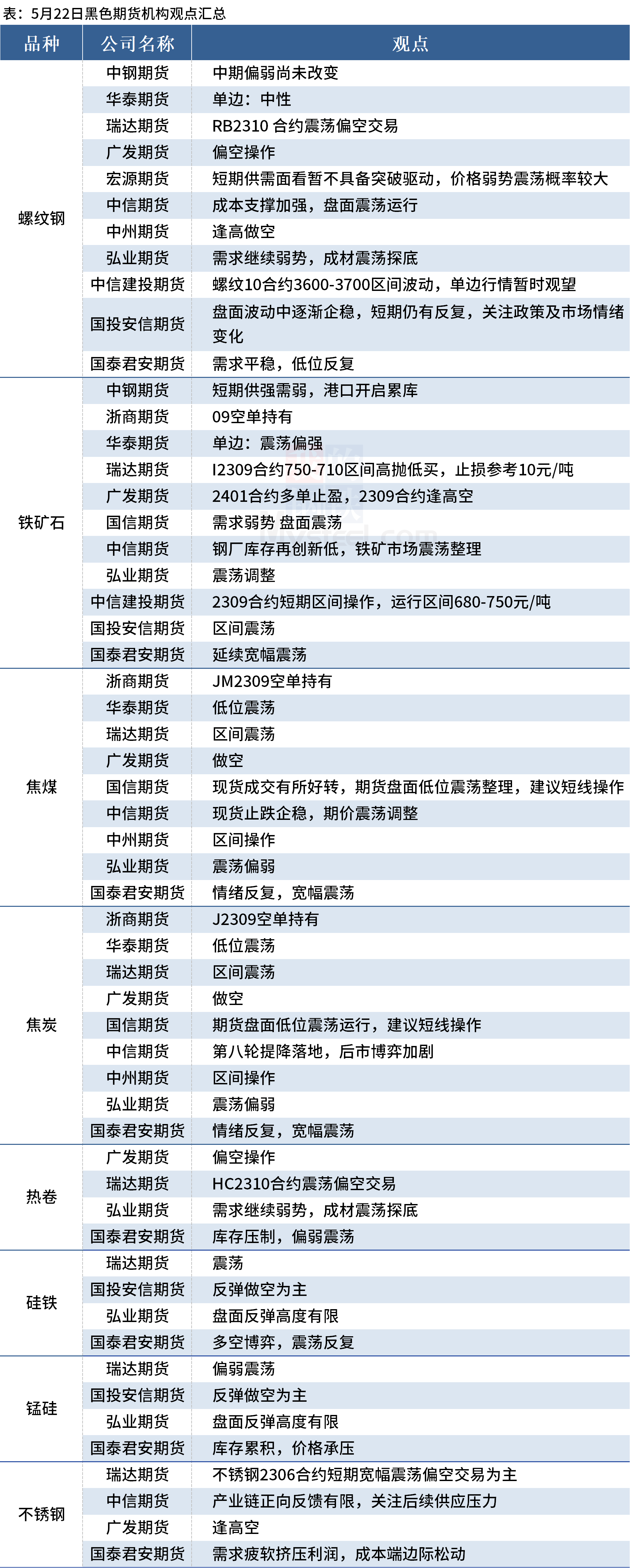据Mysteel统计5月22日12家期货机构操作策略,其中多数机构料螺纹钢震荡偏弱,铁矿石震荡运行,焦煤、焦炭震荡运行。具体汇总内容如下: