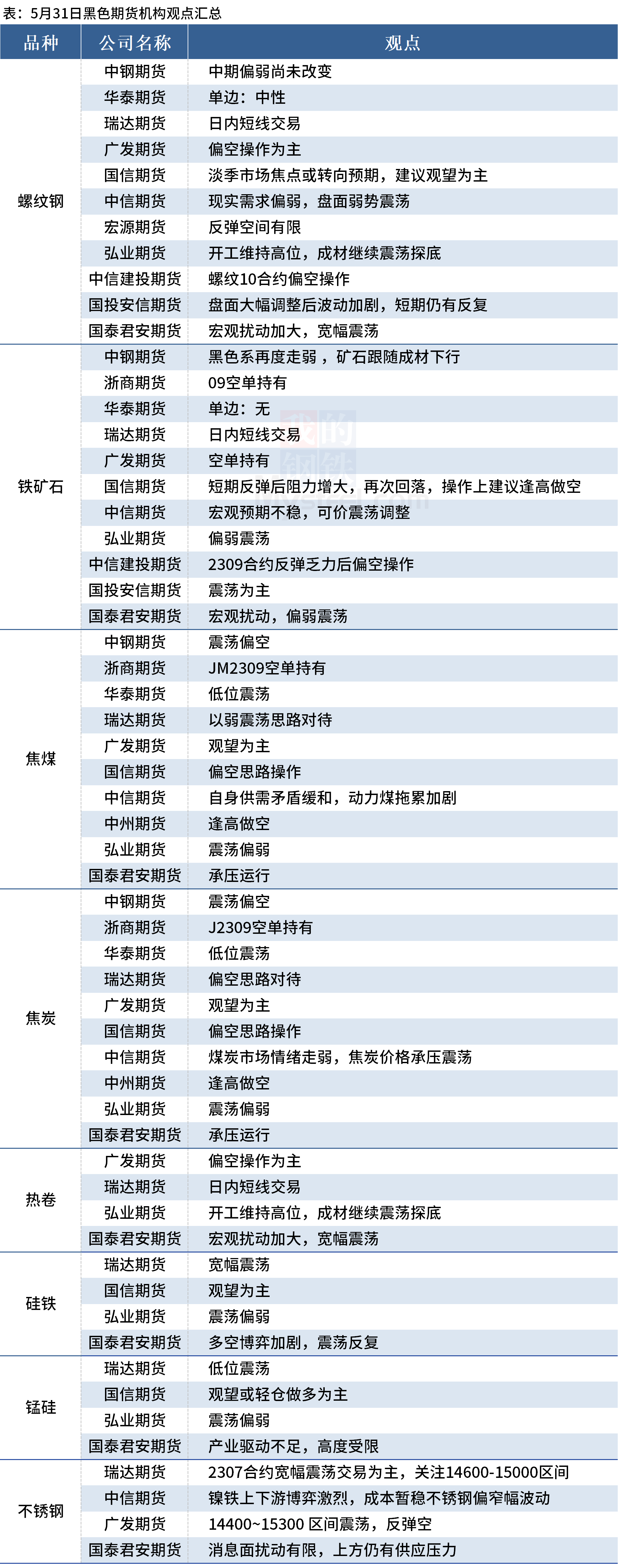 据Mysteel统计5月31日11家期货机构操作策略,其中多数机构料螺纹钢震荡运行,铁矿石震荡运行,焦煤、焦炭震荡偏弱。具体汇总内容如下: