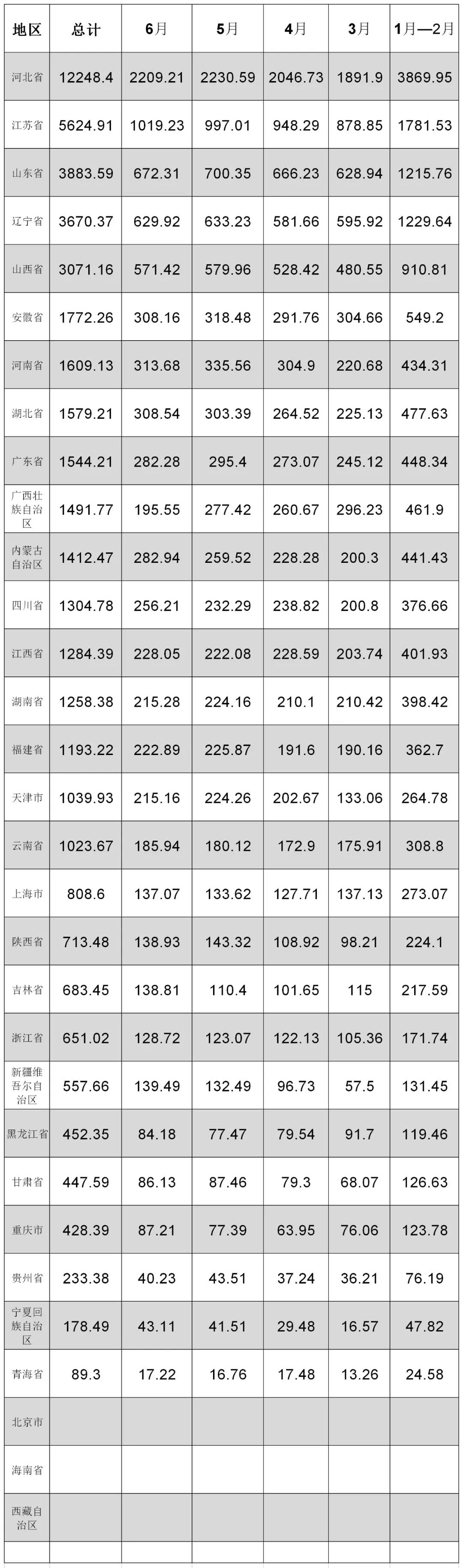 2020年上半年各省市区粗钢产量具体如下: