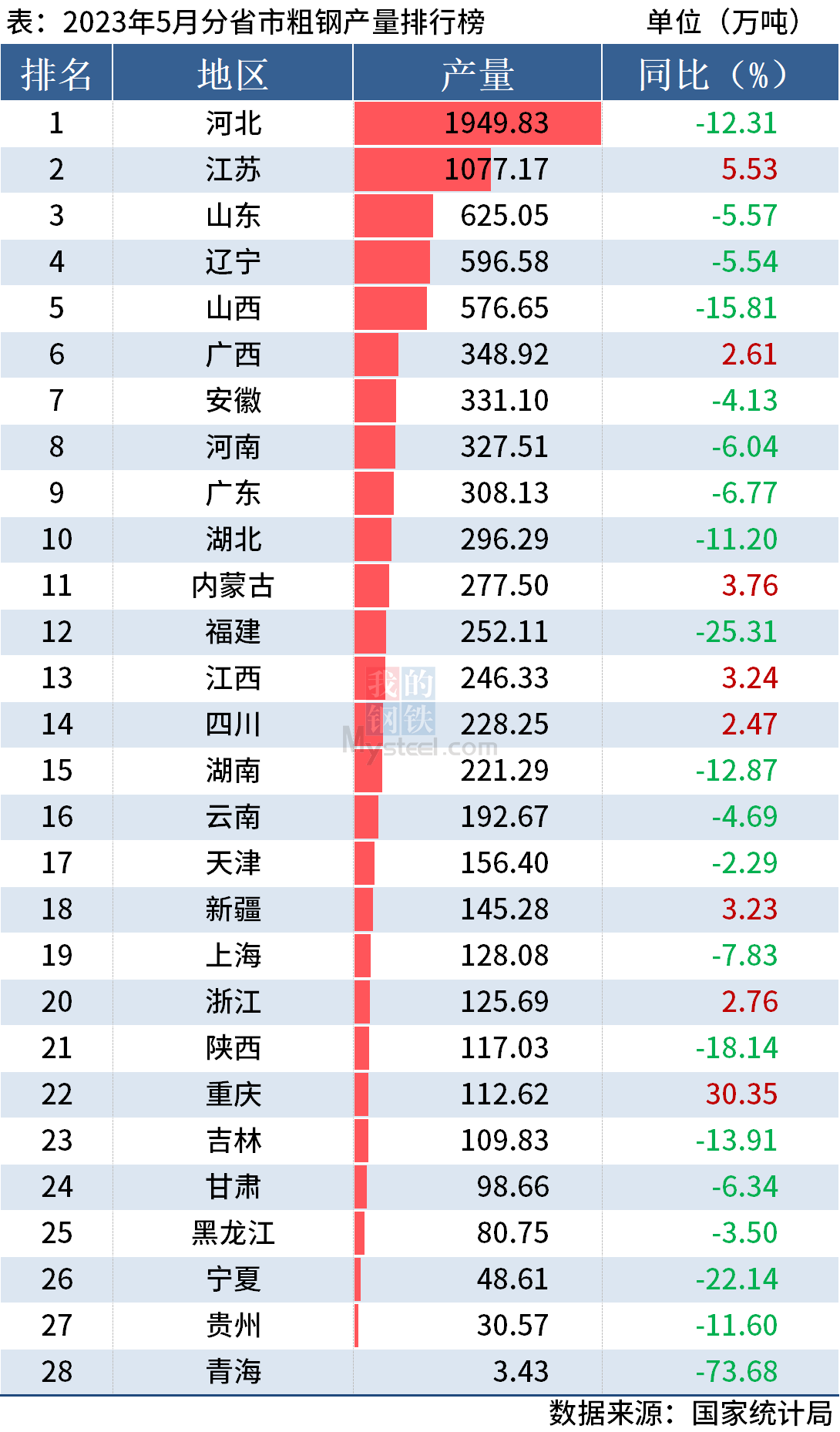 统计局:前5月全国分省市粗钢产量出炉,河北同比增6.3%