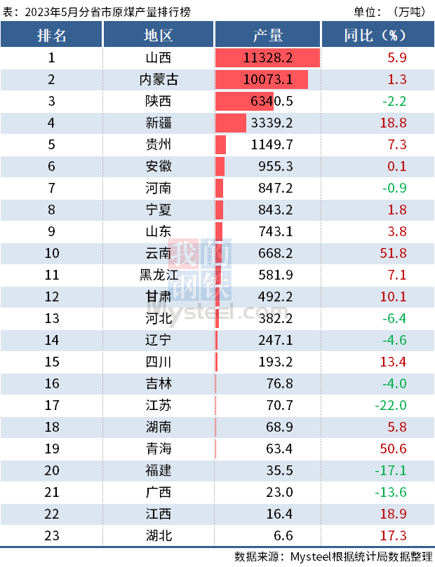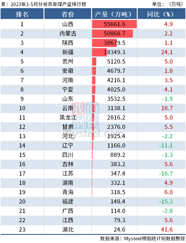 从分省数据来看,1-5月山西、内蒙古、陕西、新疆、贵州5省原煤产量合计为160679.6万吨,占全国总产量的84.0%。其中,山西、内蒙古、陕西、新疆、贵州原煤产量累计同比分别增长4.9%、2.2%、1.1%、24.1%和5.0%。