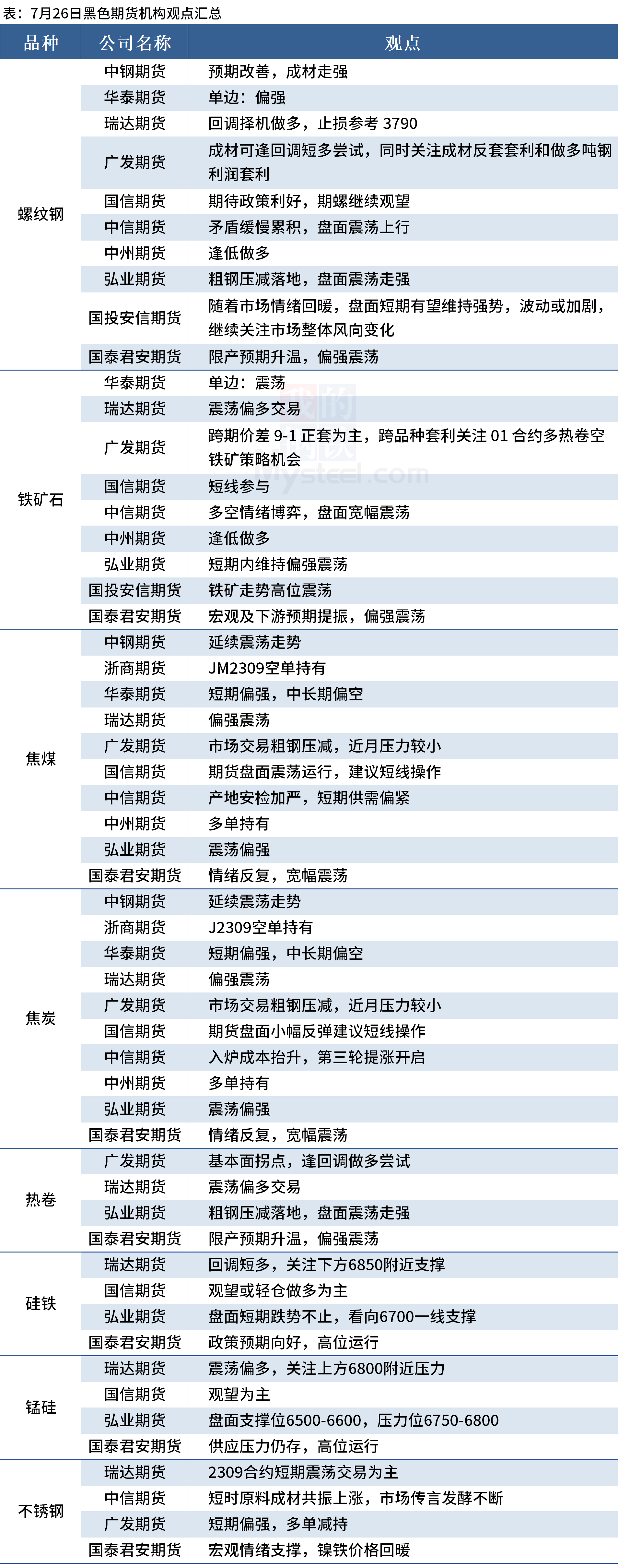 据Mysteel统计7月26日11家期货机构操作策略,其中多数机构料螺纹钢偏强震荡,料铁矿石震荡运行,焦煤、焦炭震荡运行。具体汇总内容如下:
