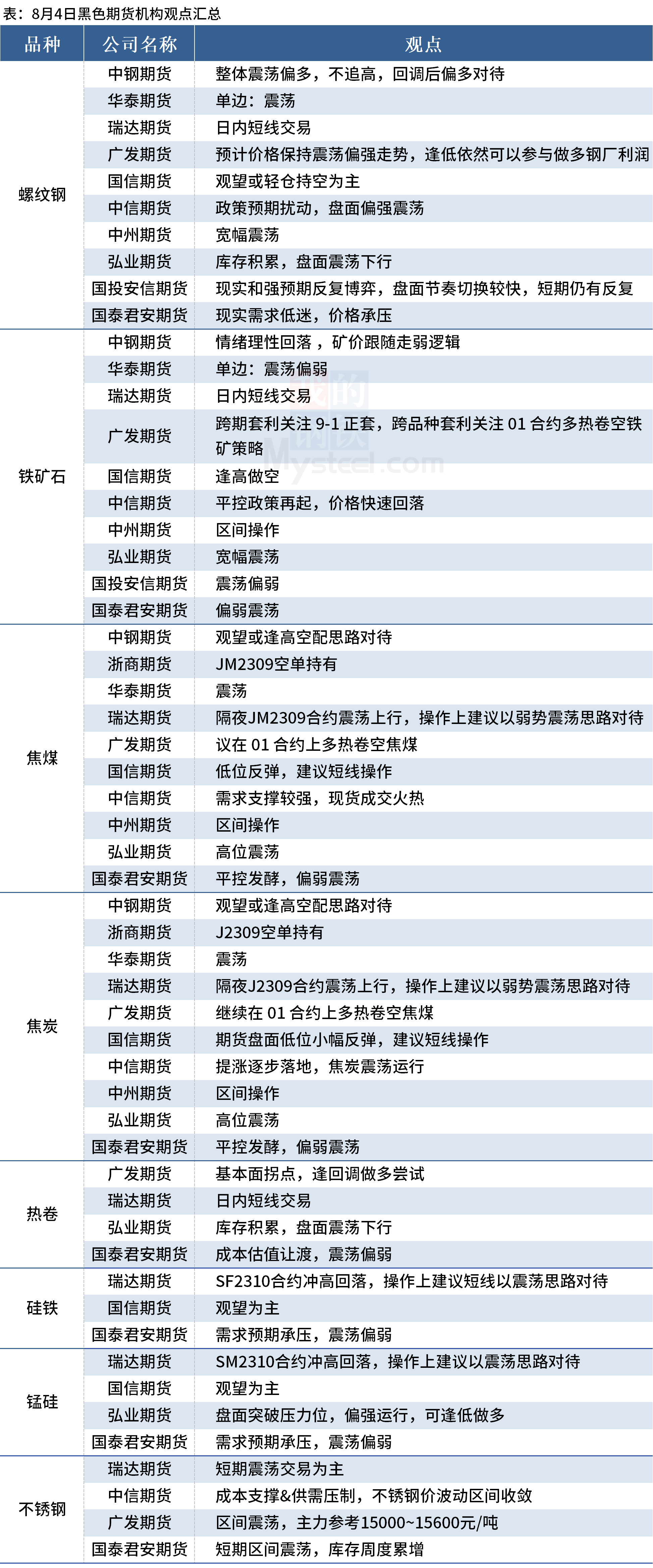 据Mysteel统计8月4日10家期货机构操作策略,其中多数机构料螺纹钢震荡运行,铁矿石偏弱震荡,焦煤、焦炭高位震荡。具体汇总内容如下: