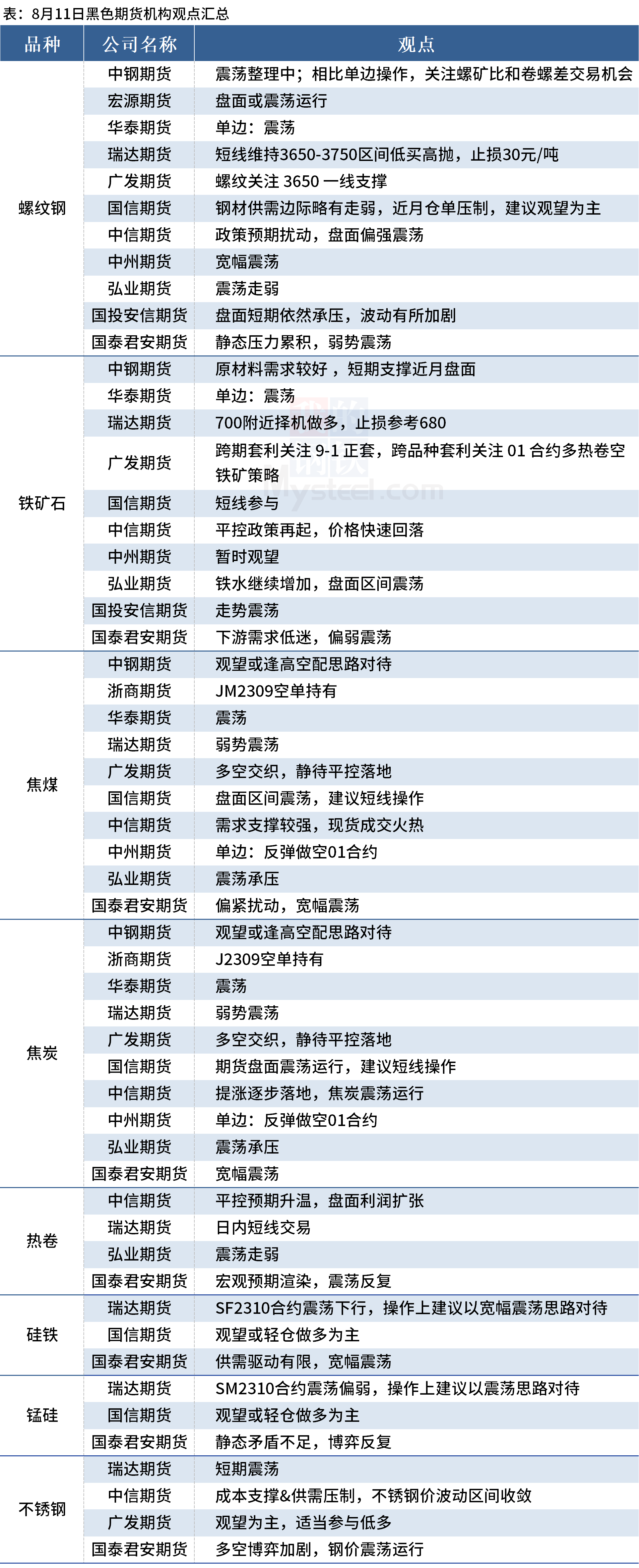 Mysteel统计8月11日10家期货机构操作策略,其中多数机构料螺纹钢震荡运行,铁矿石震荡运行,焦煤、焦炭震荡运行。具体汇总内容如下: