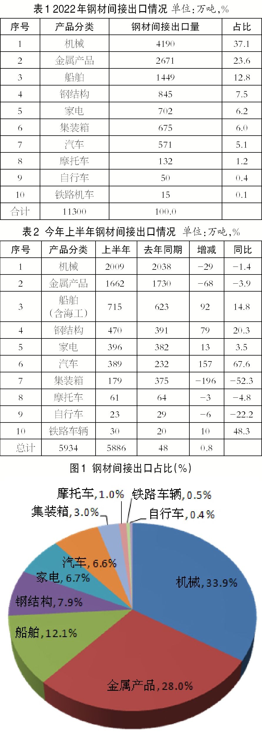 在全球经济增速放缓的大背景下,2022年下半年以来全球货物贸易量增速下降,并成为全球普遍现象。据世界贸易组织预计,2023年全球货物贸易量增长1.7%,明显低于过去12年的平均水平。按美元计价,2023年1月—6月份我国机电产品出口额下降0.8%,其中5月份和6月份连续两个月同比负增长,我国货物出口面临较大下行压力。与此同时,今年初以来,国外部分国家对中国钢铁产品贸易摩擦案件频发,不利于下游用钢产品的出口。今年下半年,在国家一系列“稳外贸”政策措施的支撑下,预计我国出口仍将保持一定的韧性,2023年钢材间接出口大体保持平稳。