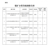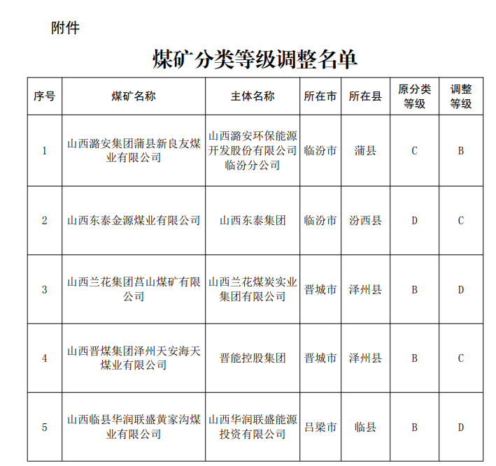 2023年8月份接到临汾市、吕梁市、晋城市5座煤矿关于调整煤矿分类等级的报告,按照《山西省人民政府办公厅关于印发山西省煤矿分级分类安全监管监察办法的通知》(晋政办发〔2020〕22号)第九条第二款和有关分类标准规定,经审核,同意山西潞安集团蒲县新良友煤业有限公司由C类调整为B类;山西东泰金源煤业有限公司(原山西煤炭运销集团巨同塬煤业有限公司)由D类调整为C类;山西晋煤集团泽州天安海天煤业有限公司由B类调整为C类;山西兰花集团莒山煤矿有限公司、山西临县华润联盛黄家沟煤业有限公司由B类调整为D类。现将调整后煤矿分类名单进行公告,各级煤矿安全监管监察部门按照调整后的类别实施监管监察工作。其他煤矿分类等级仍按《山西省安全生产委员会办公室关于公布2023年度煤矿分类名单的通知》(晋安办发〔2023〕10号)执行。