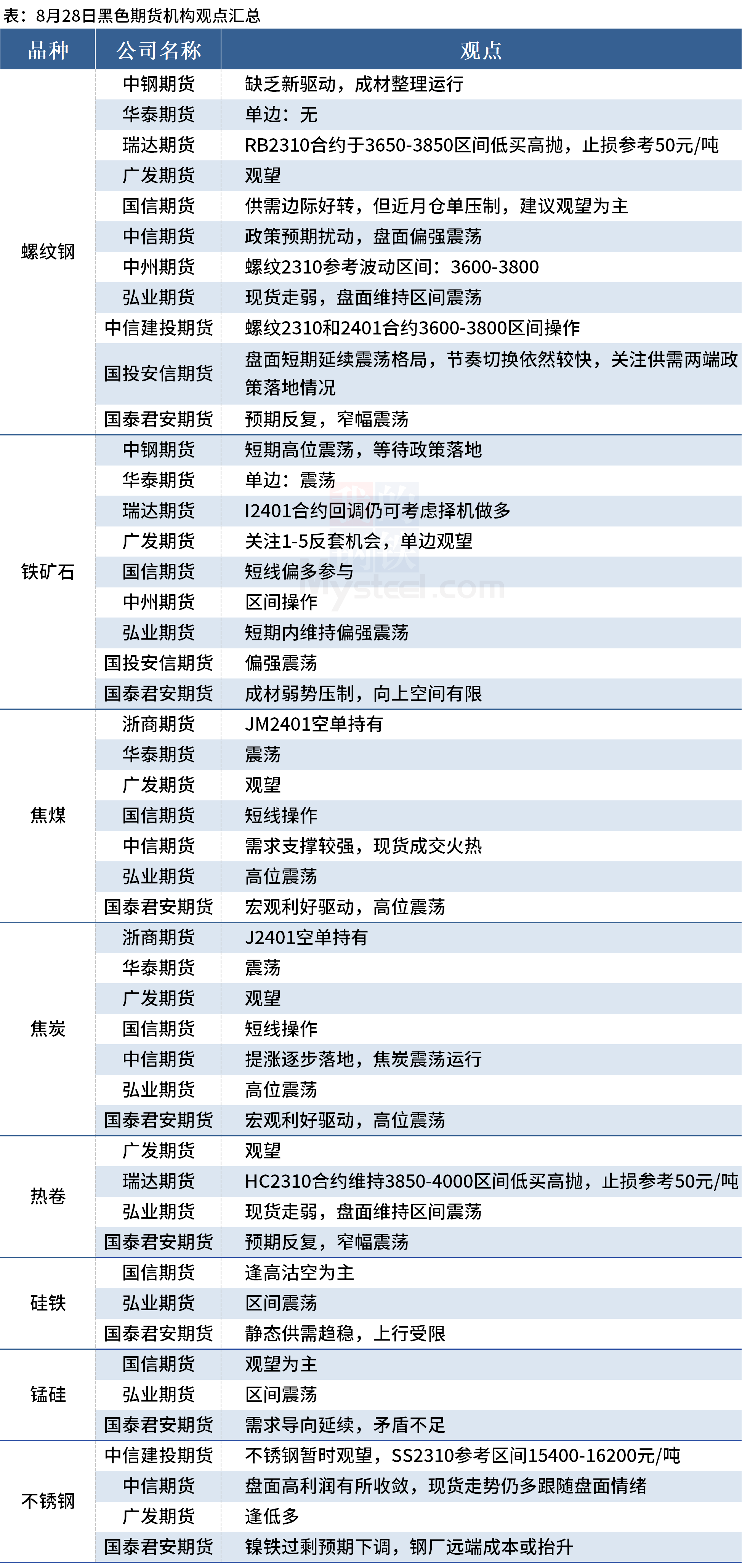 据Mysteel统计8月28日10家期货机构操作策略,其中多数机构料螺纹钢震荡运行,铁矿石偏强震荡,焦煤、焦炭震荡运行。具体汇总内容如下: