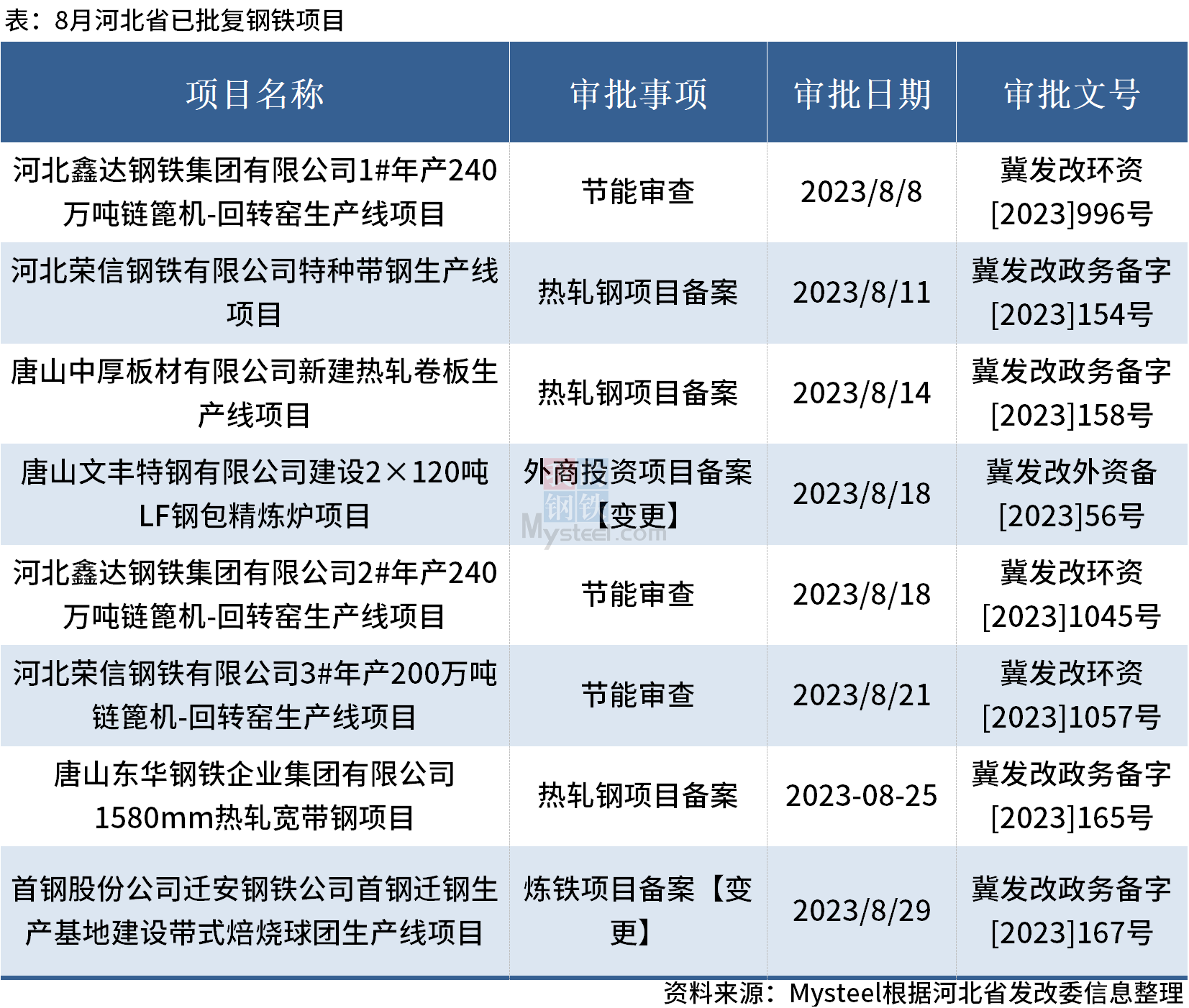Mysteel:8月河北8钢铁项目获批