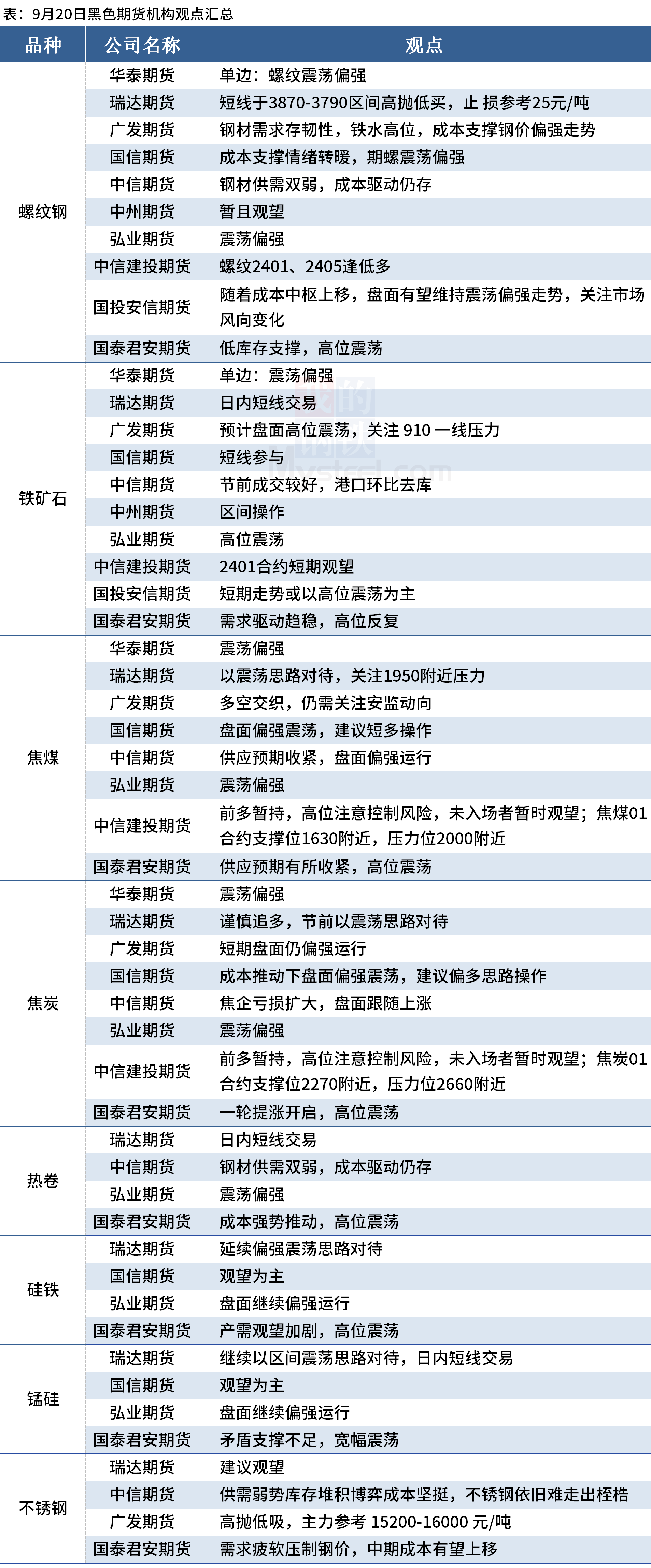 据Mysteel统计9月20日11家期货机构操作策略,其中多数机构料螺纹钢震荡偏强,铁矿石震荡运行,焦煤、焦炭震荡偏强。具体汇总内容如下: