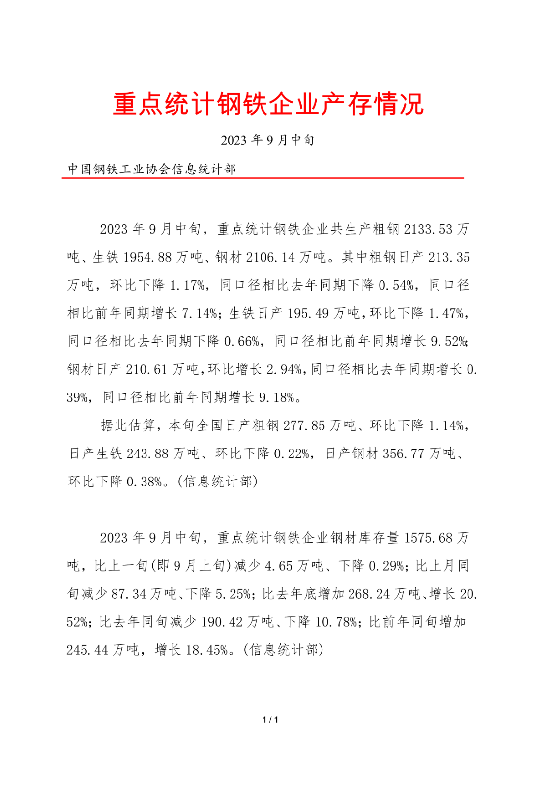 据中钢协数据显示,2023年9月中旬,重点钢企粗钢日产213.35万吨,环比下降1.17%,同口径相比去年同期下降0.54%;钢材库存量1575.68万吨,比上一旬下降0.92%,比上月同旬下降5.25%。