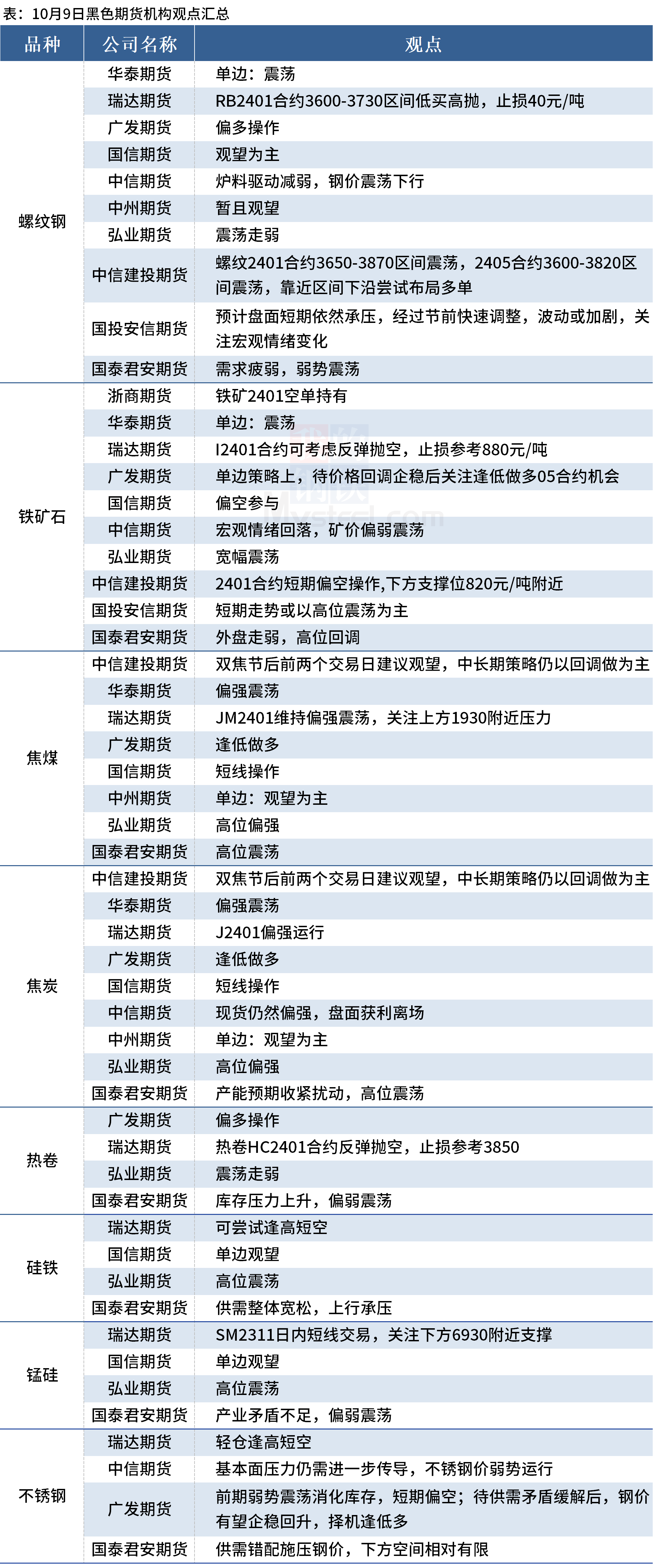 据Mysteel统计10月9日11家期货机构操作策略,其中多数机构料螺纹钢震荡运行,铁矿石震荡运行,焦煤、焦炭震荡运行。具体汇总内容如下: