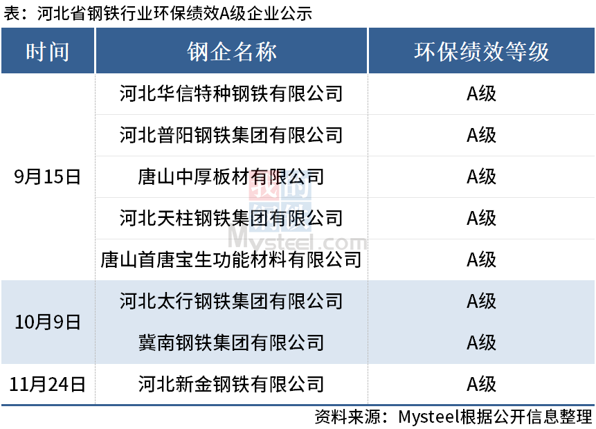 不完全统计,2023年9月至11月,河北省生态环境厅发布8家钢厂评定为环保绩效A级企业,具体如下: