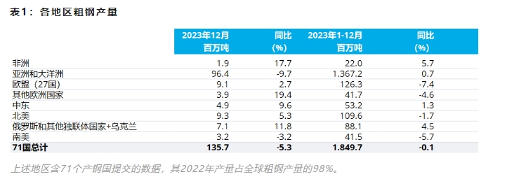 2023年12月全球71个纳入世界钢铁协会统计国家的粗钢产量为1.357亿吨,同比下降5.3%。