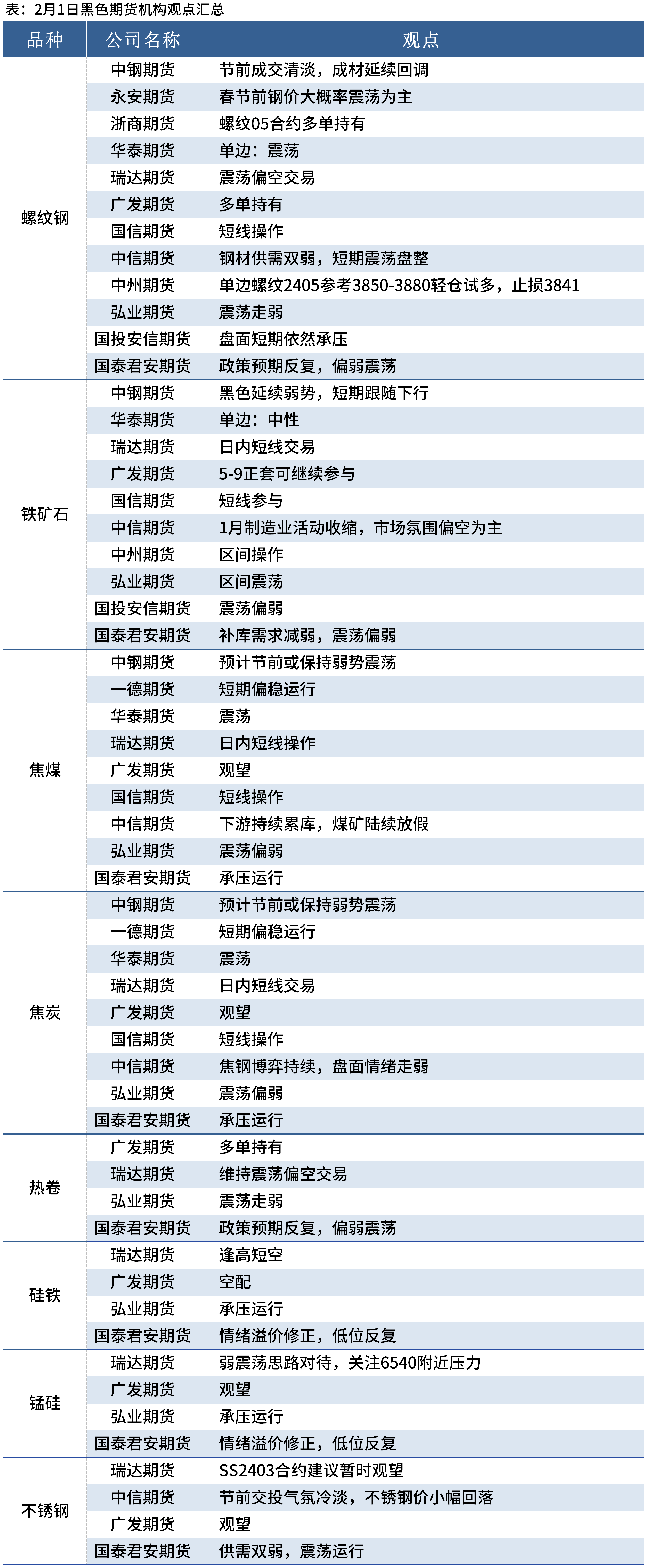 据Mysteel统计2月1日13家期货机构操作策略,其中多数机构料螺纹钢震荡运行,铁矿石震荡运行,焦煤、焦炭震荡运行。具体汇总内容如下:
