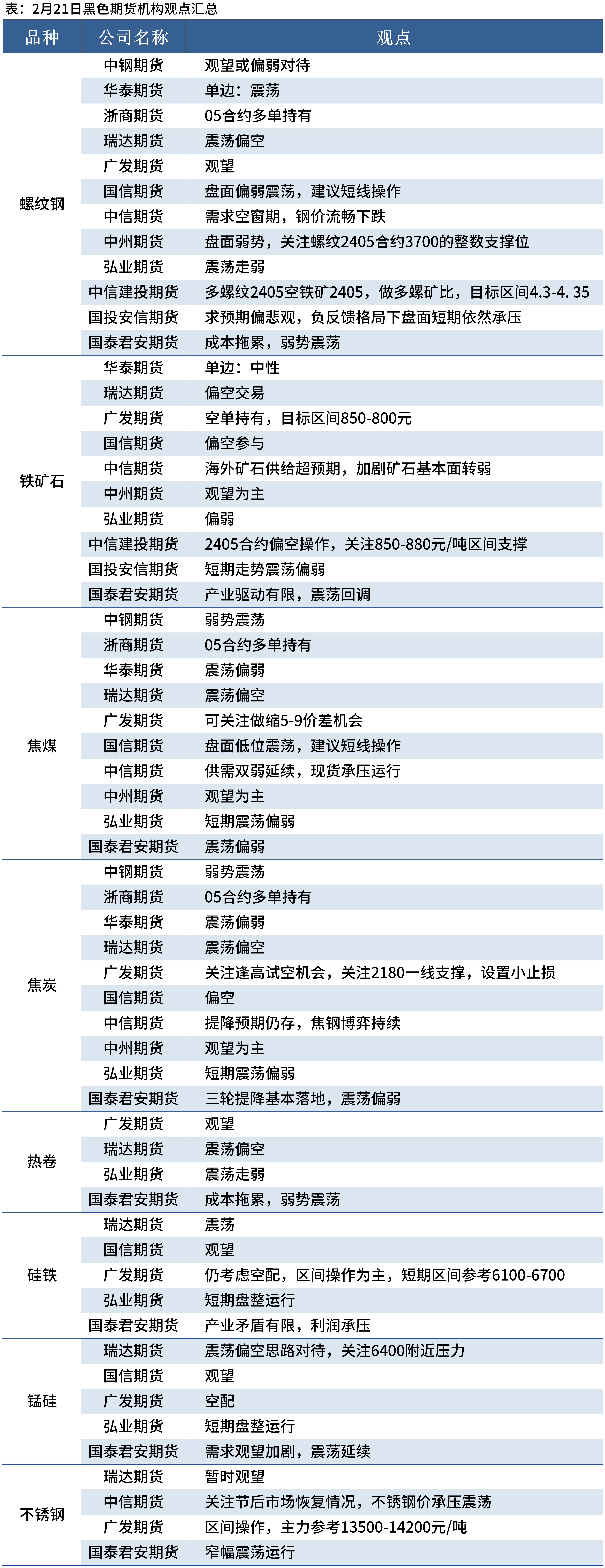 据Mysteel统计2月21日12家期货机构操作策略,其中多数机构建议铁矿石偏空操作,料螺纹钢震荡偏弱,焦煤、焦炭震荡偏弱。具体汇总内容如下: