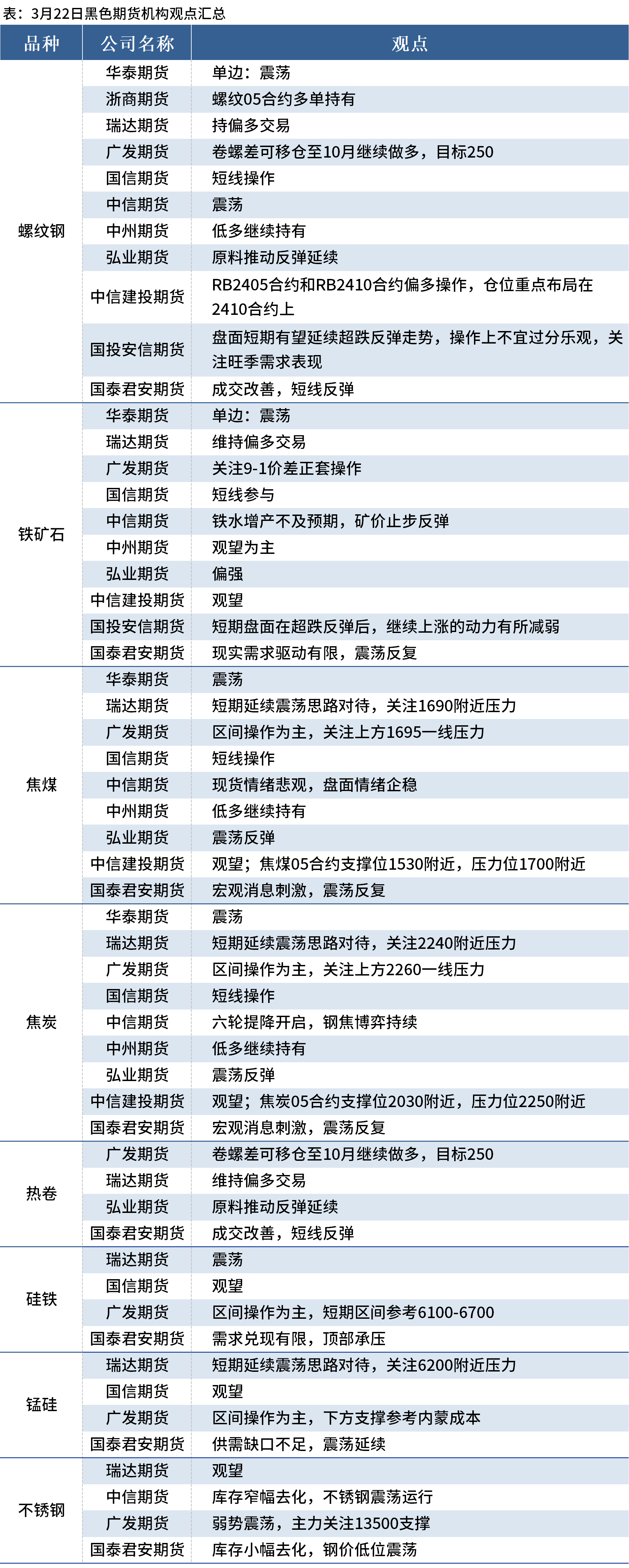 据Mysteel统计3月22日11家期货机构操作策略,其中多数机构看多螺纹钢,料铁矿石震荡运行,焦煤、焦炭震荡运行。具体汇总内容如下: