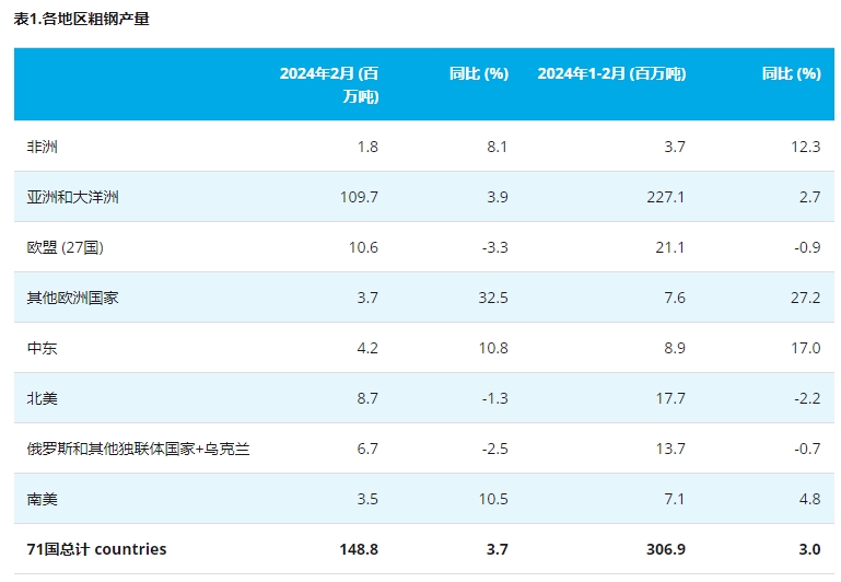 2024年2月全球71个纳入世界钢铁协会统计国家的粗钢产量为1.488亿吨,同比增长3.7%。
