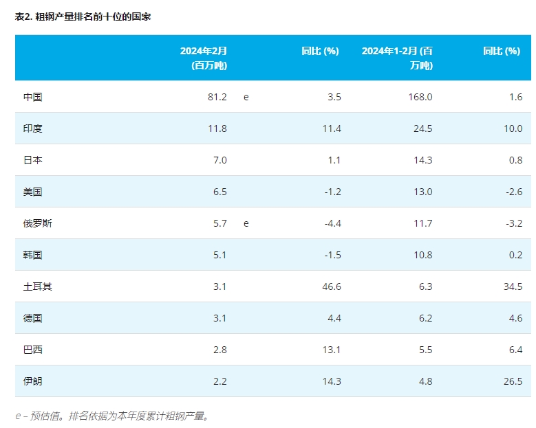 2024年2月,中国粗钢预估产量为8118万吨,同比提高3.5%;印度粗钢产量为1180万吨,同比提高11.4%;日本粗钢产量为700万吨,同比提高1.1%;美国粗钢产量为650万吨,同比下降1.2%;俄罗斯粗钢预估产量为570万吨,同比下降4.4%;韩国粗钢产量为510万吨,同比下降1.5%;土耳其粗钢产量为310万吨,同比提高46.6%;德国粗钢产量为310万吨,同比提高4.4%;巴西粗钢产量为280万吨,同比提高13.1%;伊朗粗钢产量为220万吨,同比提高14.3%。