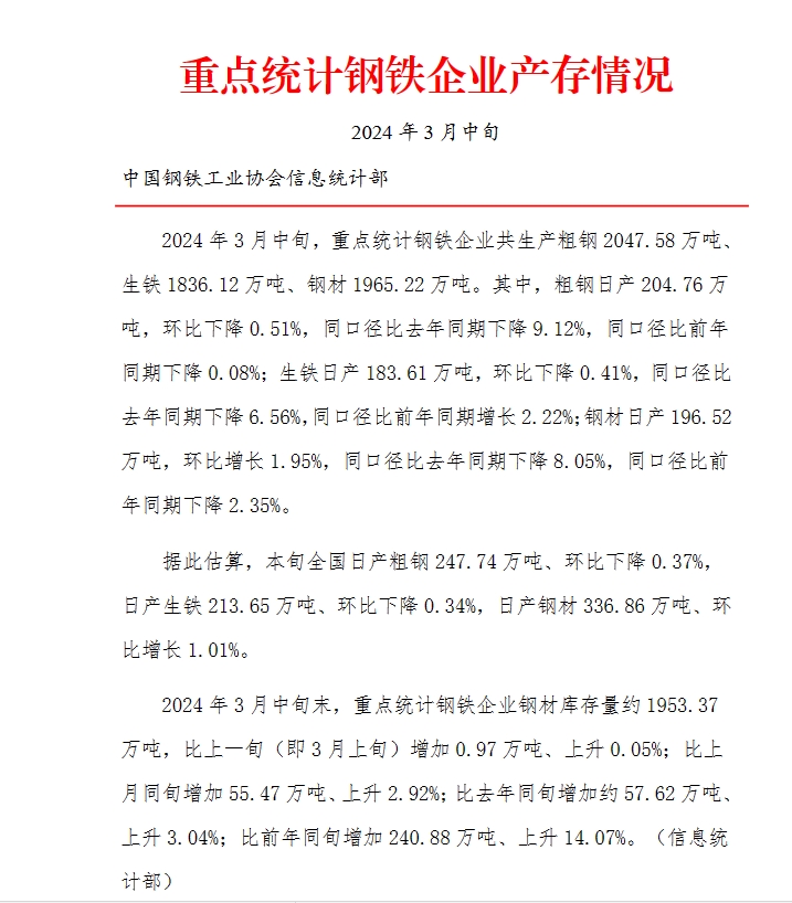 据中钢协数据显示,2024年3月中旬,重点统计钢铁企业粗钢日产204.76万吨,环比下降0.51%,同口径相比去年同期下降9.12%;钢材库存量1953.37万吨,比上一旬增长0.05%,比上月同旬增长2.92%。