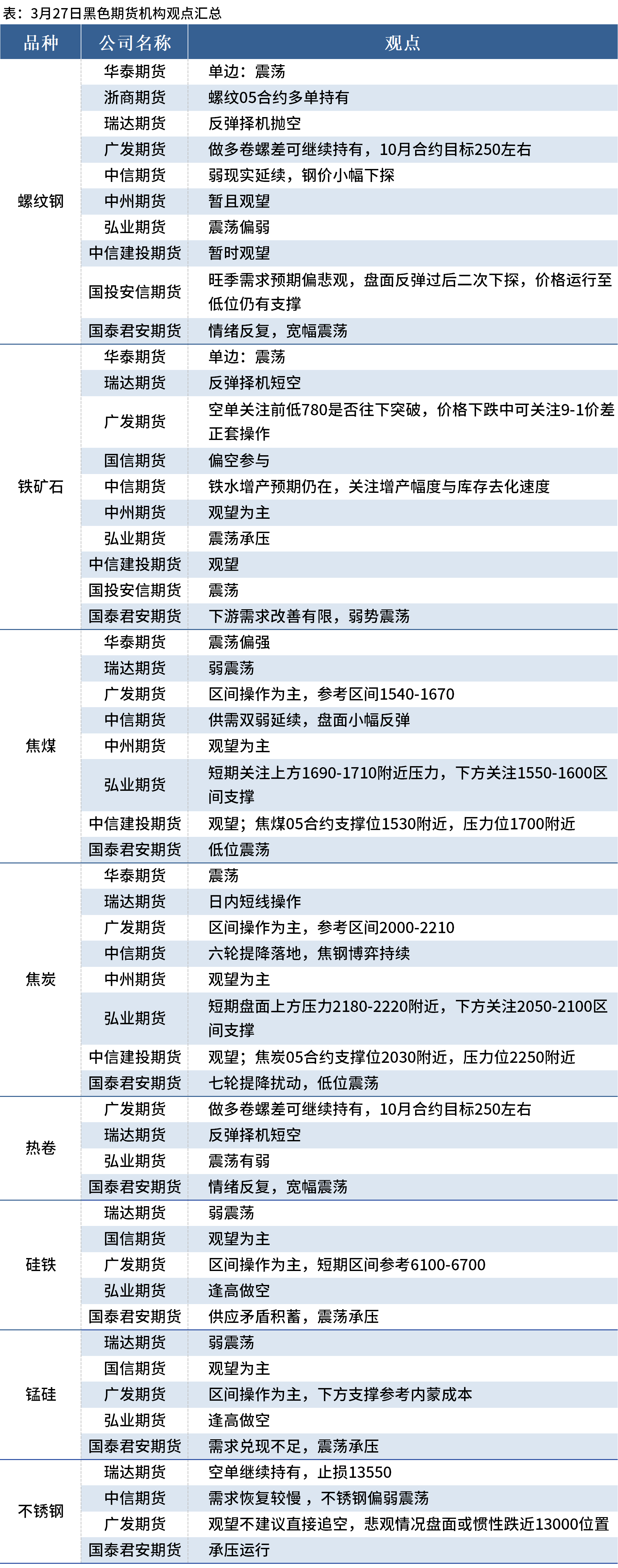 据Mysteel统计3月27日11家期货机构操作策略,其中多数机构料螺纹钢震荡运行,铁矿石震荡运行,焦煤、焦炭震荡运行。具体汇总内容如下: